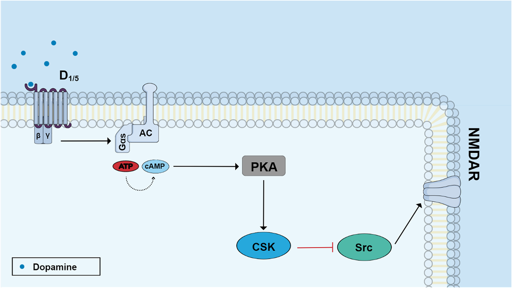 Dopamine regulates NMDA receptor function through the PKA/CSK/Src pathway. Stimulation of D1-like receptors with dopamine activates adenylyl cyclase and increases cyclic AMP production. Activated protein kinase A (PKA) induces the phosphorylation of C-terminal Src kinase (ser 364 Csk) which phosphorylates Tyr 527 Src leading to enzyme inhibition. Src phosphorylates the subunit 2B of NMDA receptor in the residue Tyr 1472 and then Src inhibition leads to diminished receptor activity.