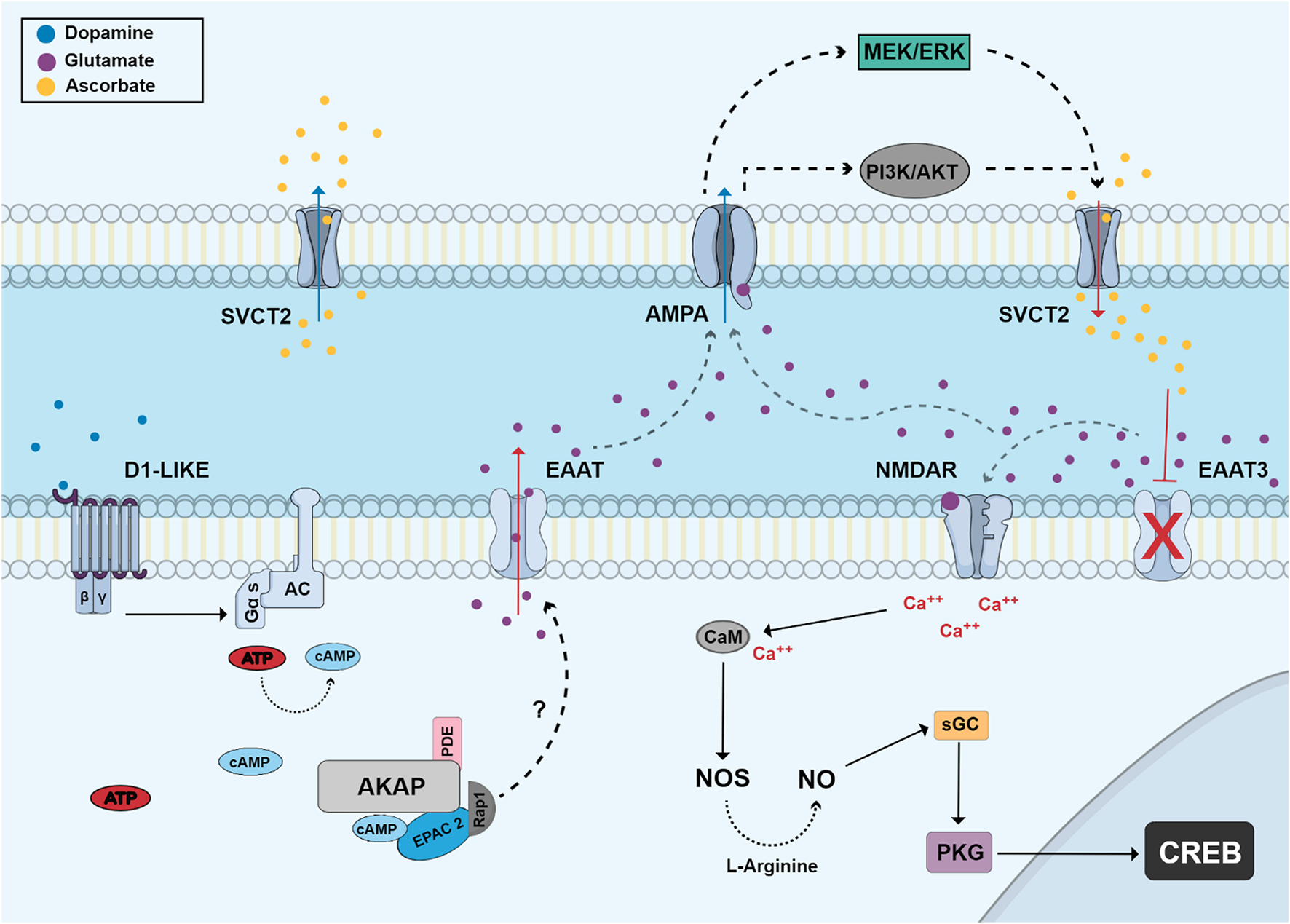 Dopamine regulates the release of vitamin C via EPAC and glutamate receptors. Dopamine stimulates D1-like receptors and activates adenylyl cyclase and cAMP production. cAMP stimulates EPAC2 and Rap1 which stimulates the release of glutamate by an unknown mechanism. Glutamate can then stimulate AMPA receptors in a second cell activating MEK/ERK and PI3K/AKT pathways and promoting ascorbate efflux through the sodium/vitamin C transporter 2 (SVCT2). Extracellular ascorbate promotes an increase of extracellular glutamate by inhibiting EAAT3 activity and then glutamate can stimulate NMDA receptors (NMDAR). This activation leads to calcium influx and increased NO production by calcium/calmodulin-dependent NOS, which then can stimulate the canonical PKG-dependent pathway and CREB phosphorylation.
