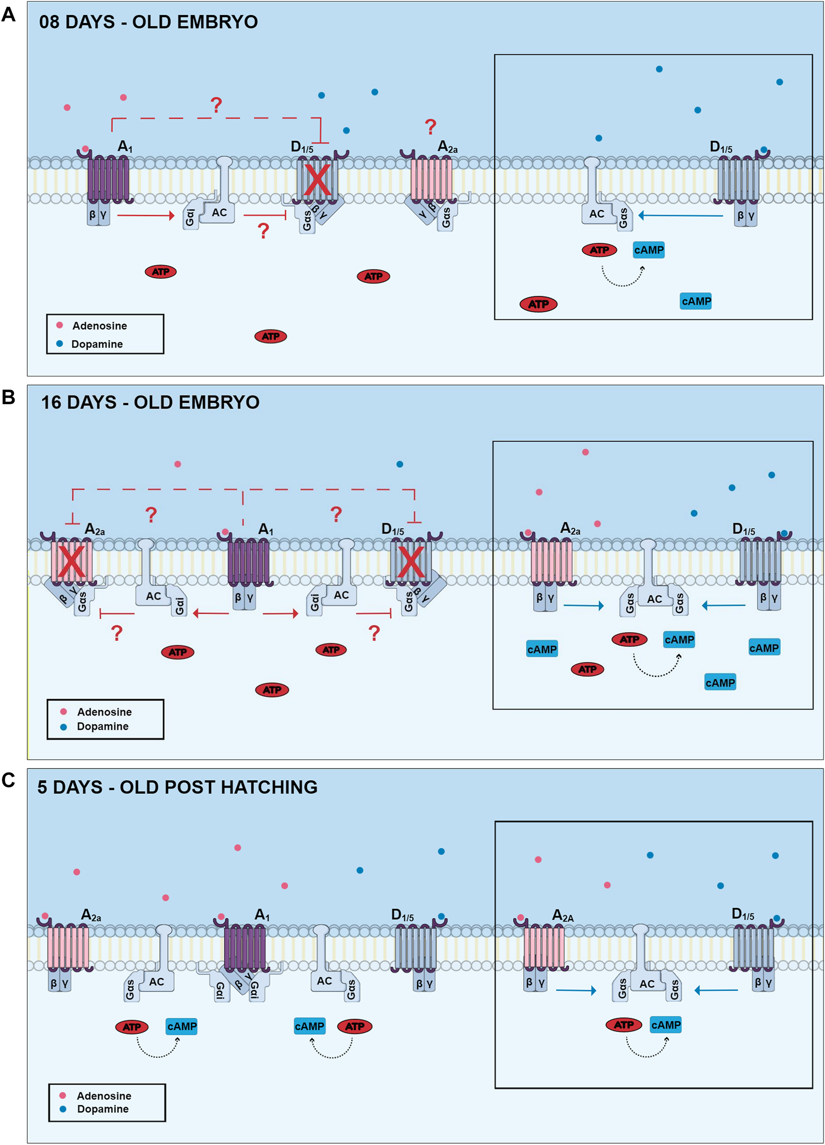 Changes of dopamine and adenosine-dependent cAMP levels in three different developmental stages of the chick retina. In E8 retinas, dopamine promotes a high increase of cAMP via stimulation of D1-like receptors (lateral picture), and this effect can be inhibited by activation of adenosine A1 receptors. Adenosine A2a receptors are present in this period but are not coupled to cAMP production. In E16 retinas, both D1 and A2a receptors are present and promote cAMP accumulation. However, cAMP increase is not additive due to the presence of A1 inhibitory receptors. In post-hatching retinas, dopamine and adenosine promote a lower increase of cAMP accumulation and A1 receptor-mediated decrease of dopamine-dependent cAMP accumulation is no longer observed. Gαi and Gαs are respectively inhibitory and stimulatory Gα protein subunits; AC, adenylyl cyclase.