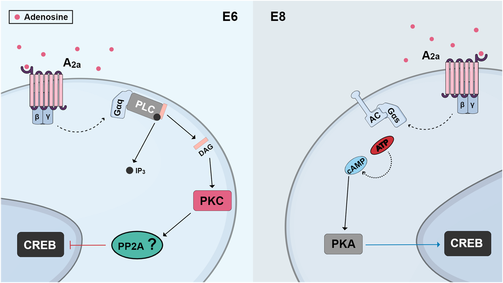 Schematic view of changes observed in CREB regulation by A2a receptors in different ages of cultures from developing chick retina. In cultures obtained from E6 retinas, activation of A2a receptors promotes phospholipase C/PKC stimulation and CREB dephosphorylation, probably through the activation of a phosphatase, leading to cell death. On the other hand, in cultures from E8 embryos, activation of A2a receptors promotes CREB phosphorylation, through a cAMP/PKA pathway, and cell survival.