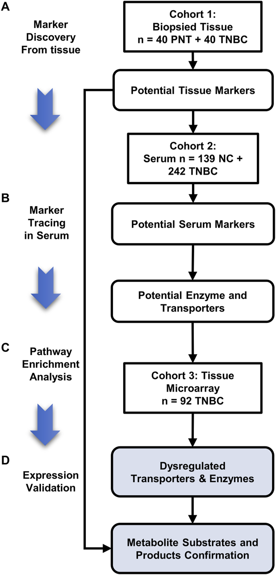 FIGURE 1. Three stages of this TNBC tissue-serum joint metabolomics workflow. (A) Marker discovery from biopsied tissue: 240 sampling points collected from 40 pairs of TNBC and PNT tissues are tested to discover the dysregulated metabolite markers by CPSI-MS and DESI-MSI; (B) marker tracing in serum: A cohort composed of 139 HD and 242 TNBC serum is tested by CPSI-MS to trace and cross validate the metabolites discovered in tissue metabolic fingerprinting; (C) Pathway enrichment analysis to pick out the potential enzymes and transporters involving in the TNBC tissue/serum metabolite dysregulation; (D) Expression validation: Through pathway enrichment analysis, upstream enzymes and transporters that involved metabolite markers regulation are located and validated on the TNBC tissue microarray and immunohistochemistry (IHC). The corresponding metabolite substrates and products are retrospectively examined and confirmed by DESI-MSI.