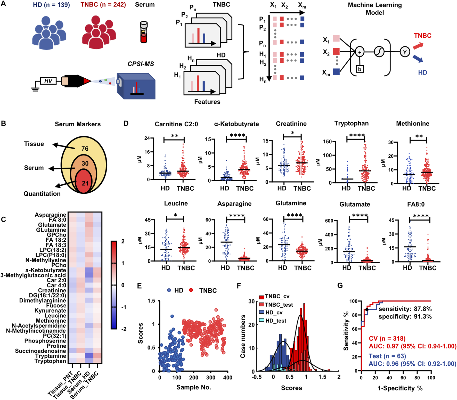 FIGURE 3. Results of serum validation for metabolite markers discovered in tissue. (A) Diagram of recruited cohort of healthy donor (HD), TNBC patients, CPSI-MS screening for serum metabolomics, and machine learning process; (B) Venn graphs display the number of metabolites that are finally selected as serum screening markers and used for quantitative estimation; (C) Heatmap visualization indicate the consistent tendencies of these characteristic metabolites in tissue and serum; (D) The quantitative comparison of representative 10 metabolite markers in serum; (E) The scores predicted by Lasso classifier on the 381 TNBC and HD serum samples; (F) Histograms display the distribution of HD and TNBC samples in the training and test sets; (G) ROC curve for assessing the performances of the metabolite markers-based Lasso model for TNBC screening. *p < 0.05, **p < 0.01, ***p < 0.001, ****p < 0.0001.
