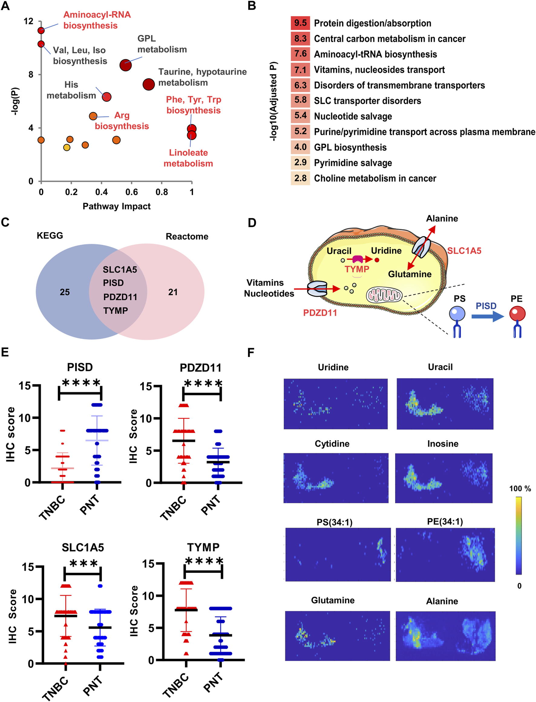 FIGURE 4. Bioinformatic analysis and expression validation for the dysregulated enzymes and transporters. (A) The enriched metabolic pathways by searching in the Metaboanalyst; (B) Rank of influenced biological functions that enzymes, and transporters are involved; (C) The enriched enzymes and transporters by searching in KEGG and Reactome; (D) Diagram illustrates the subcellular locations and functions of the PDZD, PISD, TYMP, and SLC1A5; (E) Box plots of PISD, PDZD11, TYMP, and SLC1A5 across TNBC and PNT regions; (F) Distribution across the PNT (left) and TNBC (right) for metabolite substrates and products corresponding to TYMP (Uridine, Uracil), PDZD11 (Cytidine, Inosine), PISD (PS(34:1) and PE (34:1)), and SLC1A5 (Glutamine, Alanine). ****p < 0.0001.