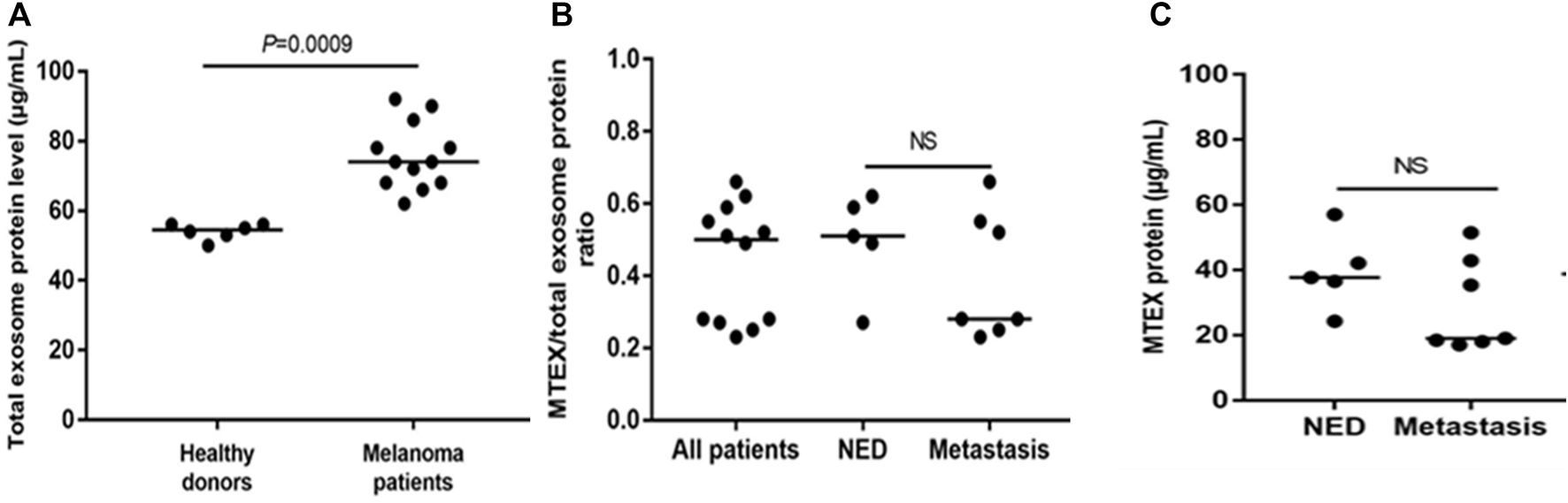 Protein levels in total plasma exosomes of melanoma patients or HDs and in isolated MTEX. In (A), total exosome protein (TEP) levels in plasma of HDs or melanoma patients. In (B), the total MTEX/TEP ratio for all patients vs. patients with NED or with progressive disease following oncological therapy. In (C), protein levels in MTEX obtained from plasma of NED patients or melanoma patients with metastases (i.e., progressive disease following oncological.