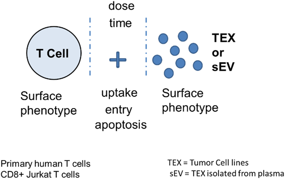 Measurement of TEX-induced phenotypic and functional changes in T cells following their co-incubation with TEX or sEV from cancer plasma. Following co-incubation at optimized doses for different time periods depending on the assay, T cells were tested for the vesicle uptake or entry into the cytosol or for changes in the surface protein profile, in growth and apoptosis levels or in mRNA transcription. Vertical stipled lines indicate that inhibitors of the T cell-TEX crosstalk can be used to block T cell-TEX interactions.