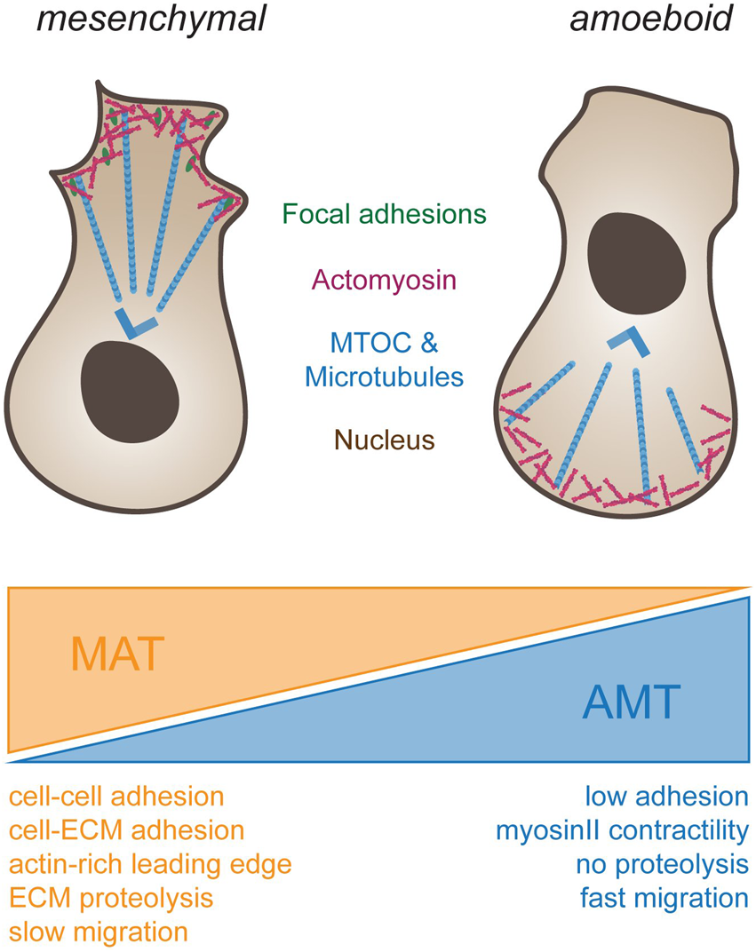 Different types of cell migration. To the left, schematic drawing of a cell using mesenchymal migration. Forces for propulsion are generated by connecting actomyosin-based forces (blue) through focal adhesions (green) to the substrate. Note that the MTOC (blue) is in front of the nucleus. To the right, amoeboid migration is depicted. Cells do not adhere to the substrate but rely on actomyosin-based compression of the cytosol at the back end of the cell for propulsion. Note that in immune cells, such as dendritic cells or macrophages, the MTOC is located behind the nucleus. Transitions from mesenchymal to ameboid migration (orange wedge, mesenchymal-amoeboid transition MAT) are promoted by low adhesion and Rho-ROCK driven Myosin-II activity (Friedl and Wolf, 2010; Graziani et al., 2022). Conversely, transition from amoeboid to mesenchymal migration (blue wedge, amoeboid-mesenchymal transition AMT) are induced by cell-cell and cell-ECM adhesions, actin-rich protrusions at the leading edge driven by Rac and Cdc42, ECM degradability and high Integrin-mediated adhesiveness (Panková et al., 2010; Graziani et al., 2022).