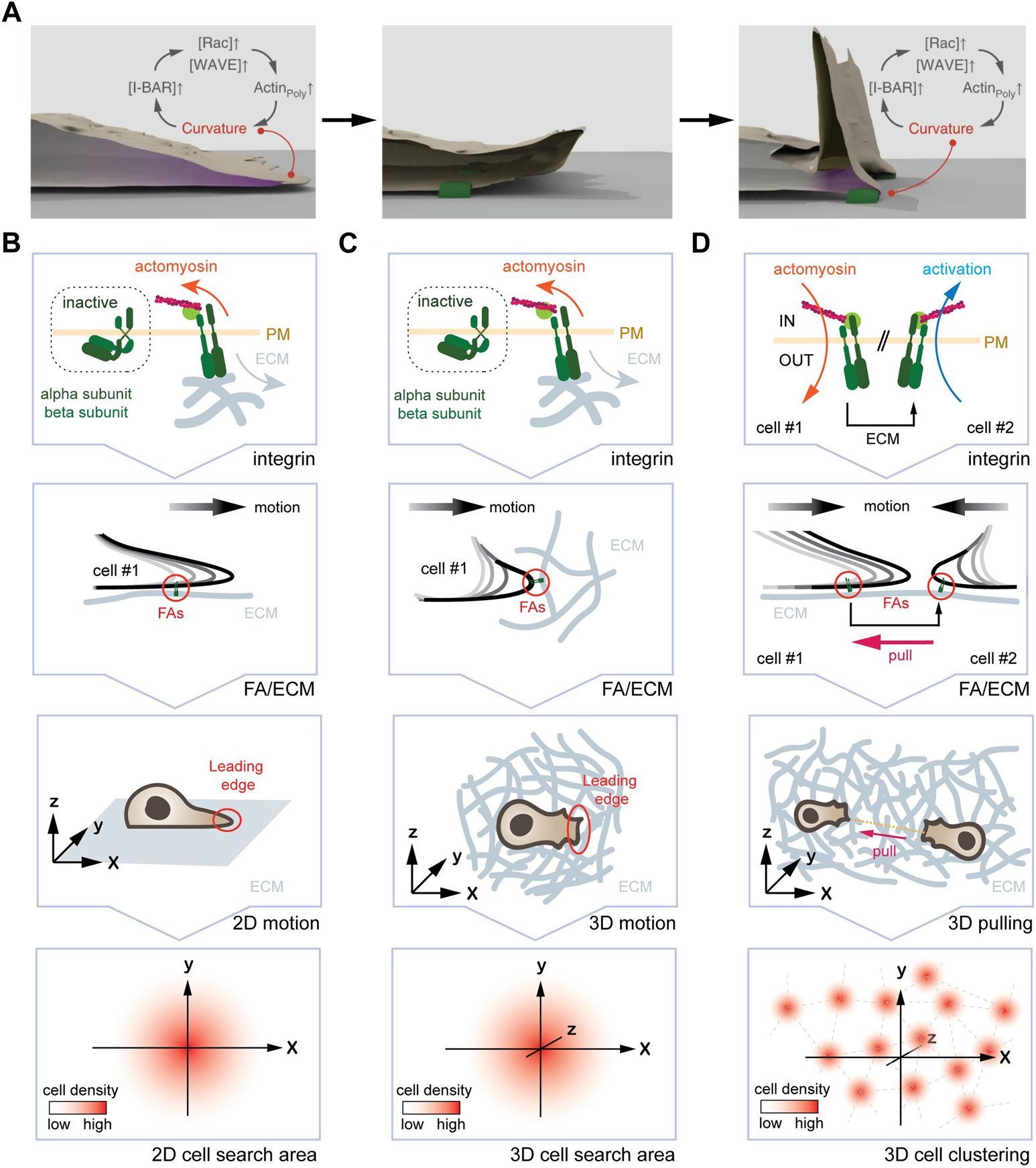 One curvature-dependent self-organizing circuit yields different emerging properties for mesenchymal cells plated in 2D and 3D. (A) Self-organizing LE re-initiation circuit in 2D. High local curvature triggers I-BAR domain protein enrichment, which further promotes actin polymerization and protrusion formation. Upon retraction, adhesion of FAs (green) to the ECM leads to a local high plasma membrane curvature, promoting I-BAR protein enrichment, increased actin polymerization, and LE re-initiation. (B) From the molecular clutch to motion pattern in 2D. From top to bottom, engagement of the molecular clutch leads to the activation of the curvature-dependent feedback-loop at the LE. The arising motion pattern displays an augmented persistence, which manifests in an increased search efficiency due to lower oversampling of the same areas. (C) From the molecular clutch to motion pattern in 3D. From top to bottom, engagement of the molecular clutch, the resulting deformation of the LE, and the arising motion pattern are shown. Again, an increase in persistence time augments the search efficiency. (D) Hypothetical mechanism for the formation of cell clusters in 3D. From top to bottom, engagement of the molecular clutch in two adjacent cells is shown. Here, one cell pulling at the ECM will cause inverse membrane deformations in an adjacent cell. This, in turn could activate the self-organizing feedback loop causing cell assembly. Image in (A) modified with permission from Begemann et al., 2019.