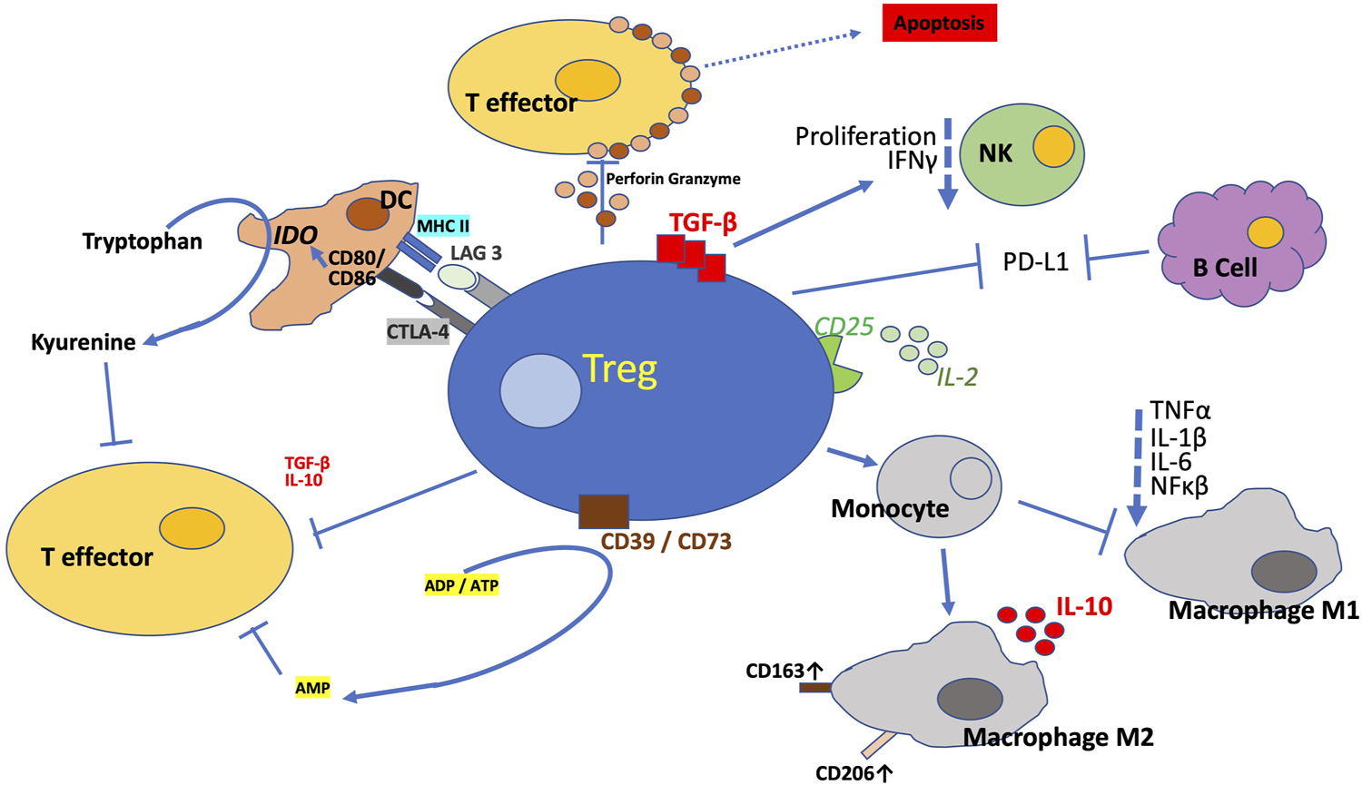 FIGURE 1. Mechanisms of Suppression. Tregs suppress innate and adaptive immune responses via myriad of direct and in-direct mechanisms to promote tolerance and dampen excessive deleterious immune response. The figure illustrates the multitude of mechanisms described via which Tregs exquisitely conducts the immune system. Treg synthesize a number of anti-inflammatory cytokines, this includes IL-10 and TGF-β and thereby modulating pro-inflammatory functions. Tregs block (co-)stimulation by antigen presenting cells via CTLA-4 and LAG3. Tregs induce apoptosis of target cells by releasing perforin and granzyme or via FasL expression. Tregs counteract pro-inflammatory signalling via ectoenzymes CD39 and CD73 which combine to dephosphorylate ATP and ADP to AMP and also through capture of IL-2 by the constitutively high expression of the IL-2 receptor α-chain, CD25. Tregs also directly impede Natural Killer cells via membrane bound TGF-β. Among the numerous mechanisms, Tregs are additionally reported to inhibit B cells via PDL-L1/PD-L2 PD-1 interaction. CTLA-4 blocks co-stimulation reducing CD80/CD86 expression and this triggers IDO upregulation. The regulatory T cells direct the differentiation of monocytes to M2 macrophages and so prevent their differentiation to M1 macrophages, which are pro-inflammatory. The Tregs also neutralise MHC II so that it is not available to the pro-inflammatory T cells. All this is ultimately controlled by increased expression of FOXP3, the principal orchestrator of Treg proliferation and stability through transcription of a number of genes. These genes promote the Treg programme via the numerous signal transduction pathways.