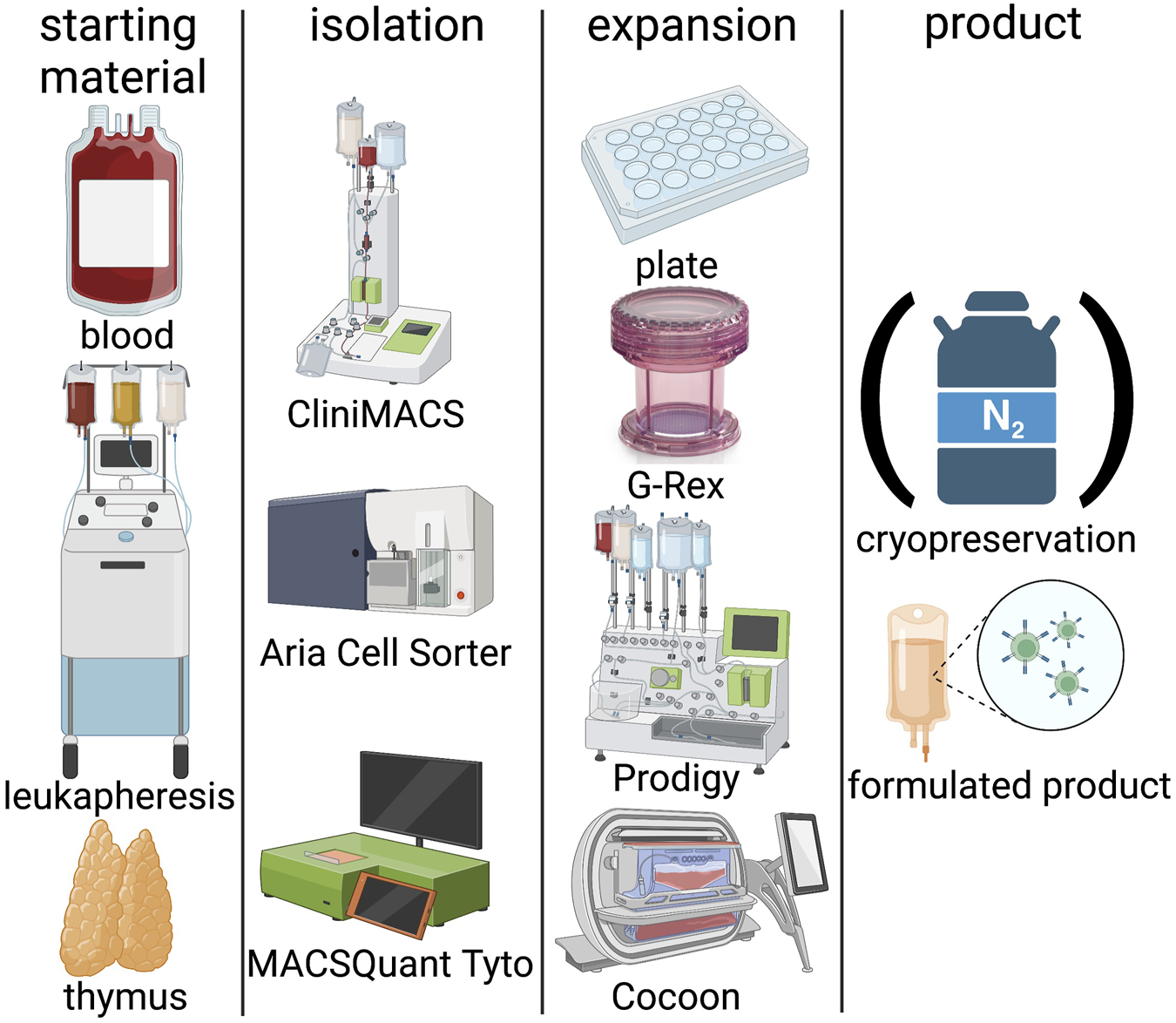 FIGURE 2. Technologies in Treg manufacturing. Blood, leukapheresis or thymi can be used as starting material. Isolation is classically performed by CliniMACS, Aria cell sorter or the more recent and GMP compliant MACSQuant Tyto system. Expansion systems include classical 24-well plates, semi-closed GRex bioreactors, or fully closed systems such as the Prodigy or Cocoon platforms. Treg products can be either frozen in liquid nitrogen or applied freshly. (Created with BioRender).