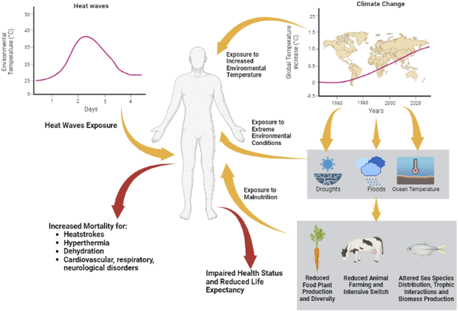 Heat challenges can be summarized as heat waves, generally considered as temperatures that are either unusually high compared to characteristic local environments, and/or climate change through the increase in average environmental temperature compared to the 1850–1900 baseline. The first have short-term effects on human health, increasing the risk of mortality for heat strokes, hyperthermia, dehydration, and cardiovascular, respiratory, or neurological disorders. The second has more complex effects on the health status and life expectancy of humans, involving increased exposure to extreme environmental conditions and exposure to malnutrition for impairment of the biosphere.