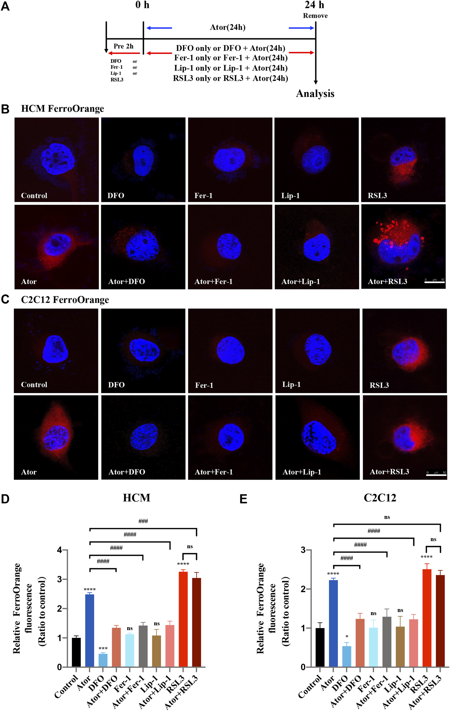 FIGURE 2. Iron accumulation in atorvastatin-supplemented HCM and C2C12 cells. (A) Experimental workflow. The muscular cells were pretreated with 100 μM DFO, 1 μM Fer-1, 1 μM Lip-1 or 0.5 μM RSL3 for 2 h and then intervened with or without 40 μM atorvastatin for another 24 h, or treated with 40 μM atorvastatin alone for 24 h. (B) Representative images of HCM treated by atorvastatin alone or with ferroptosis inhibitors DFO, Fer-1 and Lip-1 stained with FerroOrange, an indicator of intracellular Fe2+. (C) Representative images of C2C12 stained with FerroOrange. (D) Quantification of relative fluorescence intensity of FerroOrange in HCM. (E) Quantification of relative fluorescence intensity of FerroOrange in C2C12. Fluorescence intensity was quantified by ImageJ software. The data are shown as mean ± SD. ns, no significant; *p < 0.05, ***p < 0.001, ****p < 0.0001 vs. the control group; ###p < 0.001, ####p < 0.0001 vs. the atorvastatin group. n = 3. Scale bar: 10 μm.
