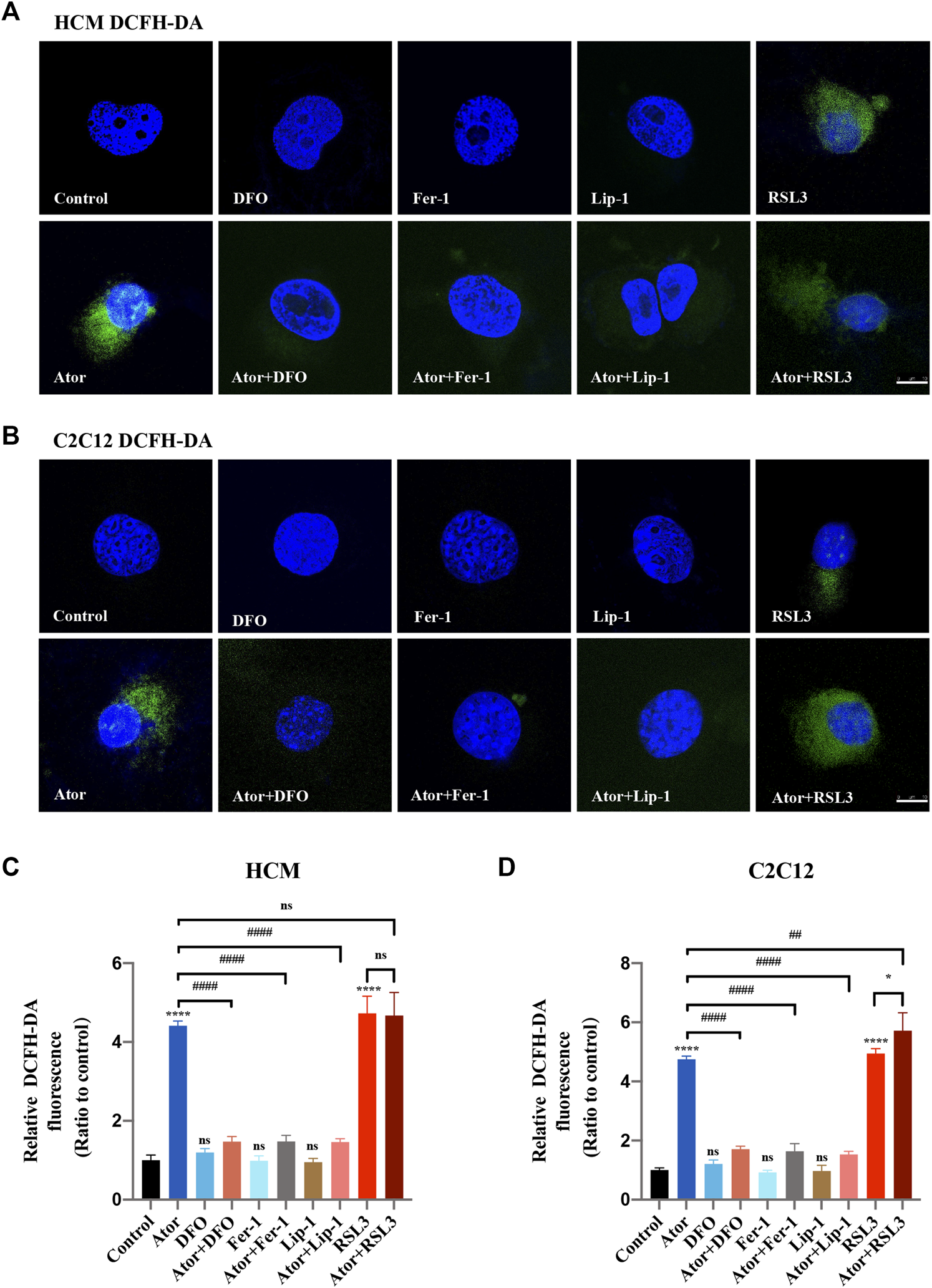 Since overloading the iron-mediated Fenton reaction followed by the ROS accumulation during ferroptosis process (Dixon et al., 2012), we then used the DCFH-DA reagent to measure the production of total ROS (Kalyanaraman et al., 2012). The staining analysis demonstrated that the ROS level was significantly increased after atorvastatin treatment in HCM (approximately fourfold compared with that of the control group; p < 0.0001) (Figures 3A,C) and C2C12 (approximately quintuple compared with that of the control group; p < 0.0001) (Figures 3B,D) cells, which restrained by ferroptosis inhibitors (about 60%; p < 0.0001). When atorvastatin cocultured with RSL3, they appear to act synergistically in C2C12, but it was not enough for the synergy in HCM (Figure 3).