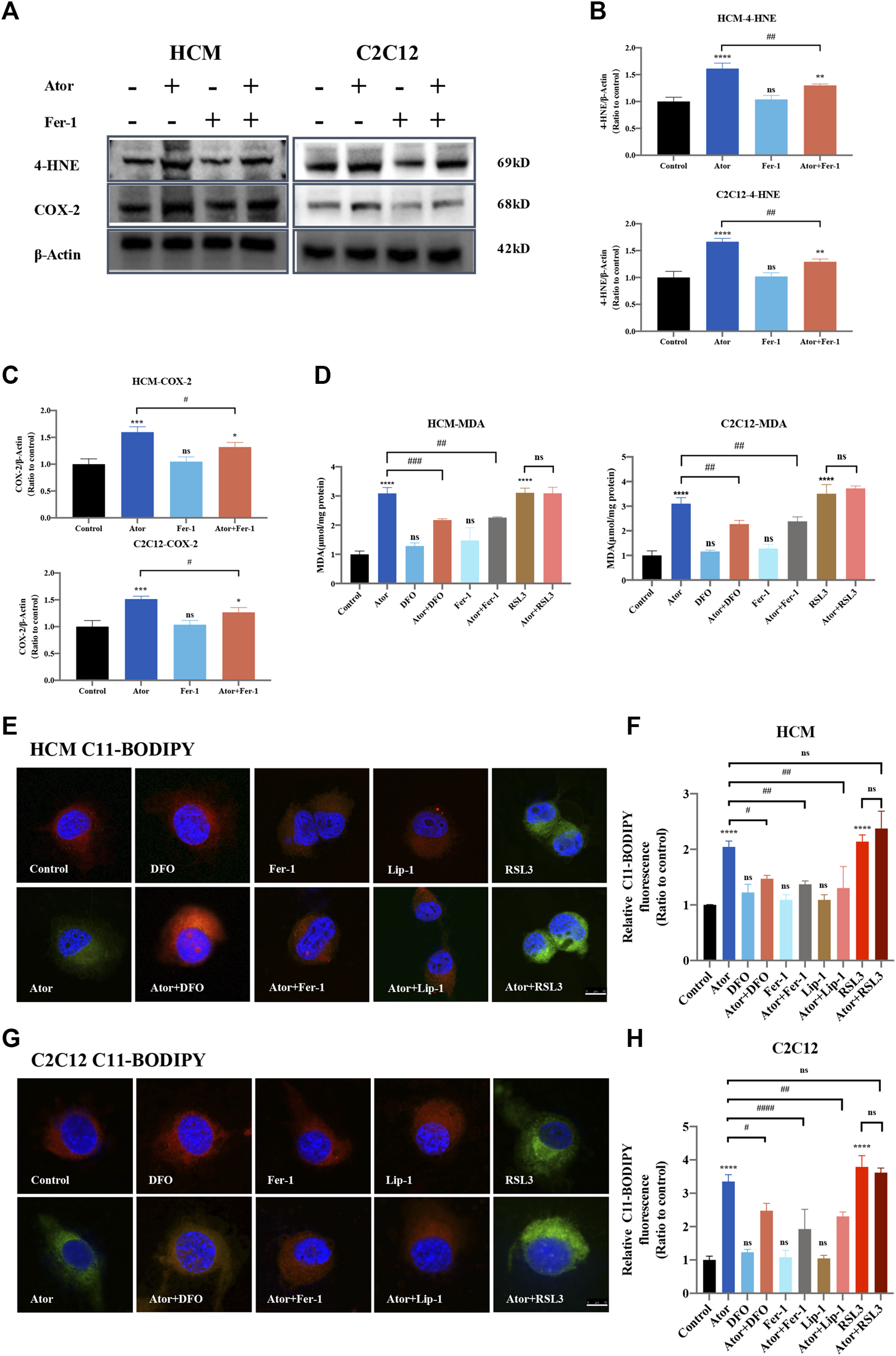 FIGURE 4. Inhibition of ferroptosis lightened atorvastatin-induced lipid peroxidation accumulation in HCM and C2C12 cells. (A) Western blot detection of 4-HNE and COX-2 expression in cells treated with Fer-1 and 40 μM atorvastatin or alone for 24 h. (B,C) Quantification of shown blot of HCM and C2C12 in (A). (D) MDA content in HCM and C2C12 in response to atorvastatin along or with ferroptosis inhibitors DFO, Fer-1 and RSL3 for 24 h detected by the TBA test. The MDA level was expressed in μmol/mg protein. (E) C11BODIPY581/591 was used as the signal of lipid peroxidation to detect the effect of atorvastatin alone or with ferroptosis inhibitors DFO, Fer-1 and Lip-1 in HCM. Red images are representative of non-oxidized lipid, while the green represent oxidized lipid images of muscular cells labeled with C11-BODIPY581/591. (F) Relative fluorescence intensity (Green) of intracellular lipid peroxidation in HCM. Quantification of (E). (G,H) Lipid peroxidation and the relative fluorescence intensity (green) of intracellular lipid peroxidation in C2C12. Fluorescence intensity was quantified by ImageJ software. The data are shown as mean ± SD. ns, no significant; *p < 0.05, **p < 0.01, ***p < 0.001, ****p < 0.0001 vs. the control group; #p < 0.05, ##p < 0.01, ###p < 0.001, ####p < 0.0001 vs. the atorvastatin group. n = 3. Scale bar: 10 μm.