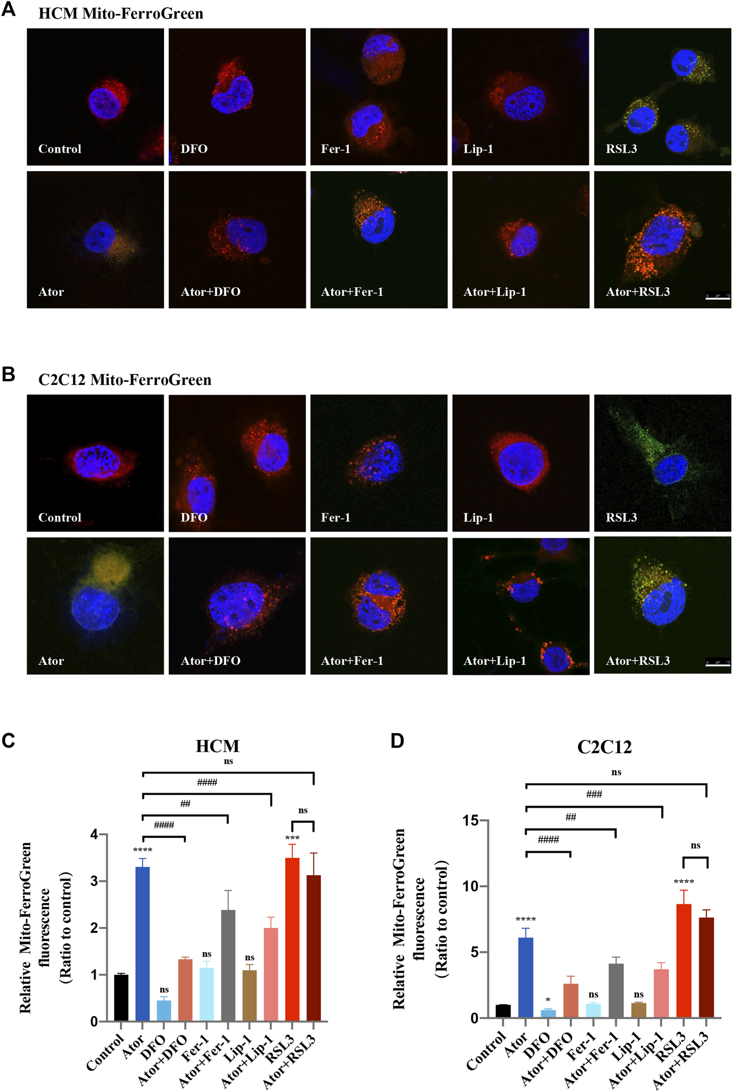FIGURE 5. Mitochondrial iron accumulation of atorvastatin exposure in HCM and C2C12 cells. Mitochondrial Fe2+ analyzed by Mito-FerroGreen. Treated cell were cocultured with the probe Mito-FerroGreen for 30 min. Red images represent mitochondrial localization using MitoTracker Red CMXRos staining. (A) Representative images of HCM treated atorvastatin alone or with ferroptosis inhibitors DFO, Fer-1 and Lip-1 stained with Mito-FerroGreen, an indicator of mitochondrial Fe2+. (B) Representative images of C2C12 stained with Mito-FerroGreen. (C,D) Quantification of relative fluorescence intensity of Mito-FerroGreen in HCM and C2C12 cells. Fluorescence intensity was quantified by ImageJ software. The data are shown as mean ± SD. ns, no significant; ***p < 0.001, ****p < 0.0001 vs. the control group; ##p < 0.01, ####p < 0.0001 vs. the atorvastatin group. n = 3. Scale bar: 10 μm.