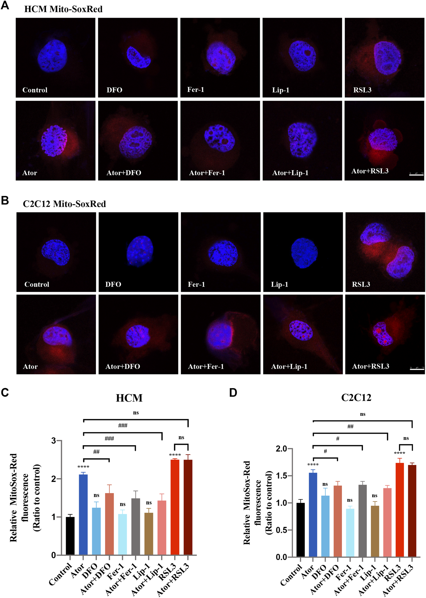 FIGURE 6. Mitochondrial ROS accumulation of atorvastatin exposure in HCM and C2C12 cells. (A) Representative images of HCM treated with atorvastatin alone or with ferroptosis inhibitors DFO, Fer-1 and Lip-1 stained with MitoSox-Red, an indicator of mitochondrial ROS. (B) Representative images of C2C12 stained with MitoSox-Red. (C, D) Quantification of relative fluorescence intensity of MitoSox-Red in HCM and C2C12 cells. Fluorescence intensity was quantified by ImageJ software. The data are shown as mean ± SD. ns, no significant; ****p < 0.0001 vs. the control group; #p < 0.05, ##p < 0.01, ###p < 0.001 vs. the atorvastatin group. n = 3. Scale bar: 10 μm.