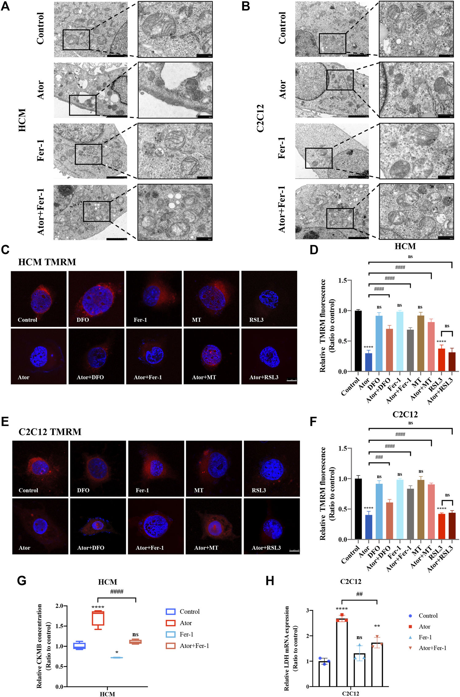 FIGURE 8. Morphological changes of mitochondria and breakdown of MMP in atorvastatin treated HCM and C2C12 cells. (A,B) Transmission electron microscopy images of mitochondria ultrastructure in both HCM and C2C12 cells. Scale bar in left lower inset: 2 μM, right lower inset: 500 nm. (C) Representative images of HCM treated atorvastatin alone or with ferroptosis inhibitors DFO, Fer-1 and MT stained with TMRM, an indicator of mitochondrial membrane potential. (D) Relative fluorescence intensity of TMRM in HCM. Quantification of (C). (E,F) Representative images and relative fluorescence intensity of TMRM in C2C12. (G) Relative levels of CKMB in HCM treated by atorvastatin alone or with Fer-1 examined by ELISA. (H) Relative mRNA expression of LDH in C2C12 treated by atorvastatin alone or with Fer-1. The fluorescence intensity was quantified by ImageJ software. The data are shown as mean ± SD. ns, no significant; *p < 0.05, **p < 0.01, ****p < 0.0001 vs. the control group; #p < 0.05, ##p < 0.01, ###p < 0.001, ####p < 0.0001 vs. the atorvastatin group. n = 3. Scale bar: 10 μm.