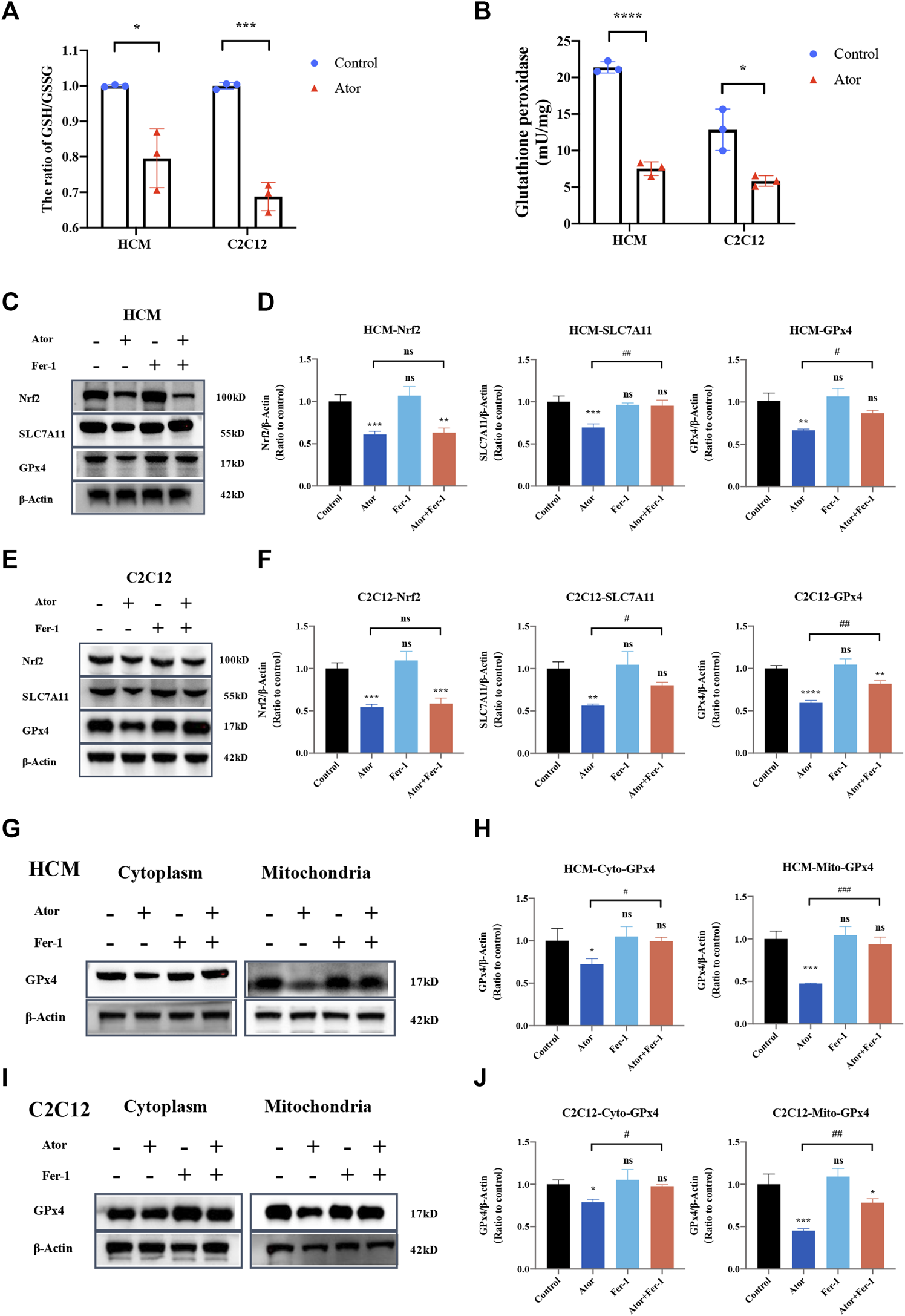FIGURE 9. Dysregulation of Nrf2-GPx4/xCT pathway was related to ferroptosis induced by atorvastatin. (A) Ratio of GSH/GSSG in lysates from the cultured myocytes. (B) Glutathione peroxidase activity in lysates from the cultured myocytes. (C, D) Expression of proteins of Nrf2, SLC7A11, and GPx4 in cultured HCM treated by atorvastatin alone or with Fer-1 detected by Western blot. (E,F) Expression of proteins of Nrf2, SLC7A11, and GPx4 in cultured C2C12 detected by Western blot. (G,H) Expression of GPx4 protein in cultured HCM atorvastatin-treated alone or with Fer-1 in cytoplasm (without mitochondria) or mitochondria detected by Western blot. (I,J) Expression of GPx4 protein in cultured C2C12 atorvastatin-treated alone or with Fer-1 in cytoplasm (without mitochondria) or mitochondria in C2C12 detected by Western blot. The fluorescence intensity was quantified by ImageJ software. The data are shown as mean ± SD. ns, no significant; *p < 0.05, **p < 0.01, ***p < 0.001, ****p < 0.0001 vs. the control group; #p < 0.05, ##p < 0.01, ###p < 0.001 vs. the atorvastatin group. n = 3. Scale bar: 10 μm.