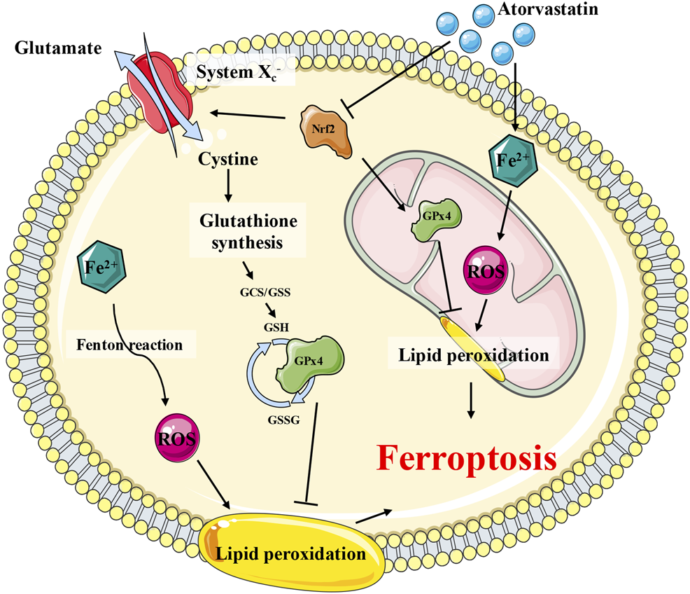 In this study, we found that ferroptosis is responsible for atorvastatin-induced muscular injury both in cardiomyocytes and skeletal muscle cells. Mechanistically, atorvastatin induces ferroptosis by suppressing the intracellular anti-oxidative system, Nrf2-xCT/GPx4 pathway, resulting in the lethal lipid peroxidation within muscular cells. Our results for the first time demonstrated that ferroptosis is the pathogenic mechanism of atorvastatin-induced myopathy, providing a novel therapeutic target for improving atorvastatin application strategies.