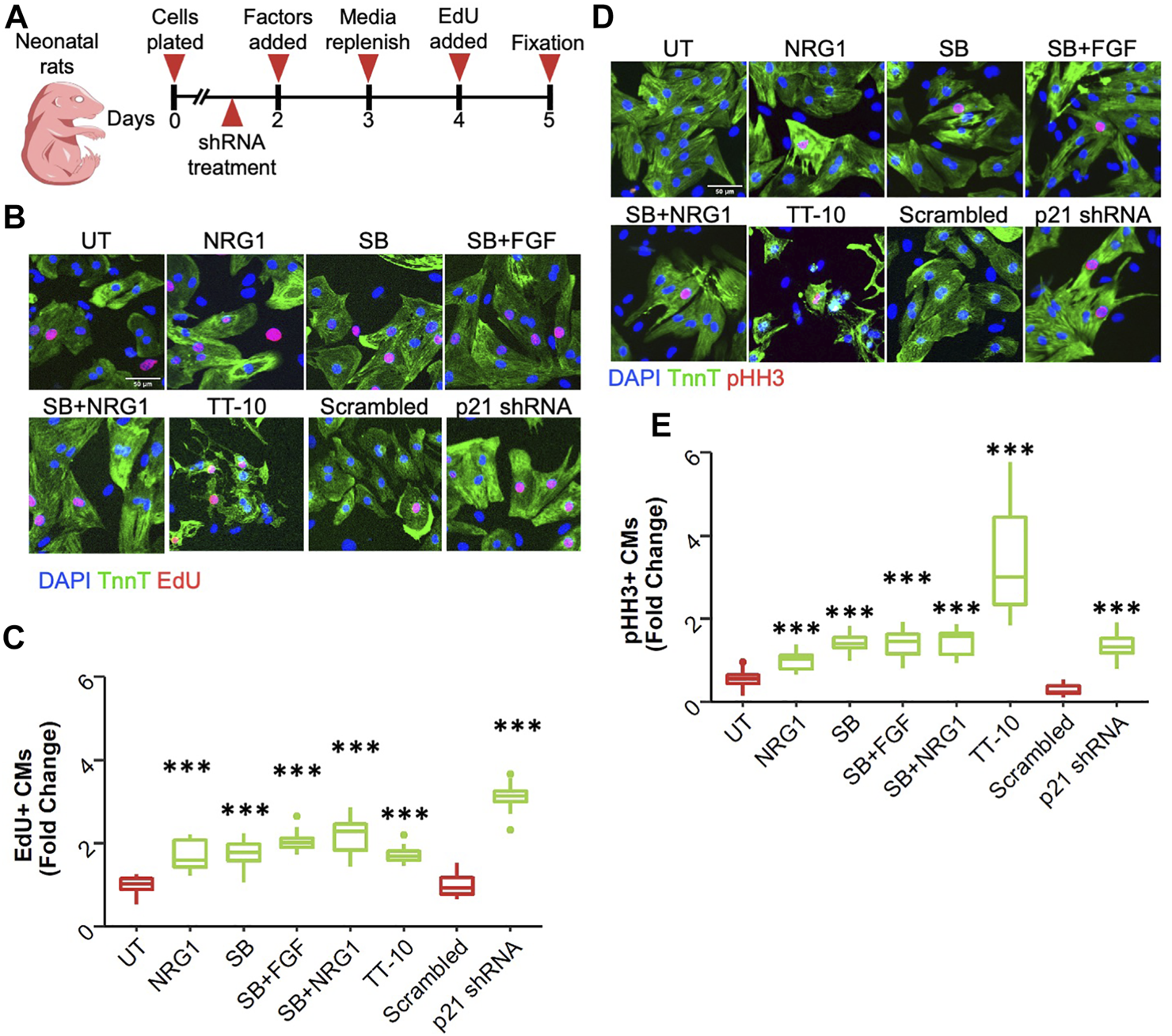 Stimulation of cardiomyocyte DNA synthesis. (A) Graphical overview of experimental outline. shRNAs are p21shRNA or scrambled shRNA adenoviruses. Other conditions are growth factors that were added on Day 2. (B) Representative images of EdU stained (red) cardiomyocytes (green) in response to various treatments to induce cardiomyocyte proliferation (green: Troponin T, red: EdU, blue: DAPI, scale bar equals 50 µm) (C) Percentage of EdU positive cardiomyocyte nuclei relative to total cardiomyocyte nuclei. ***p < 0.001 vs respective controls, n = 12 for each group except p21 shRNA (n = 11) and TT-10 (n = 10). (D) Representative images of pHH3 staining (green: Troponin T, red: pHH3, blue: DAPI, scale bar equals 50 µm) (E) Percentage of pHH3-positive cardiomyocyte nuclei relative to total cardiomyocyte nuclei. ***p < 0.001 vs respective control, n = 12 for each group except p21 shRNA (n = 11) and TT-10 (n = 10).