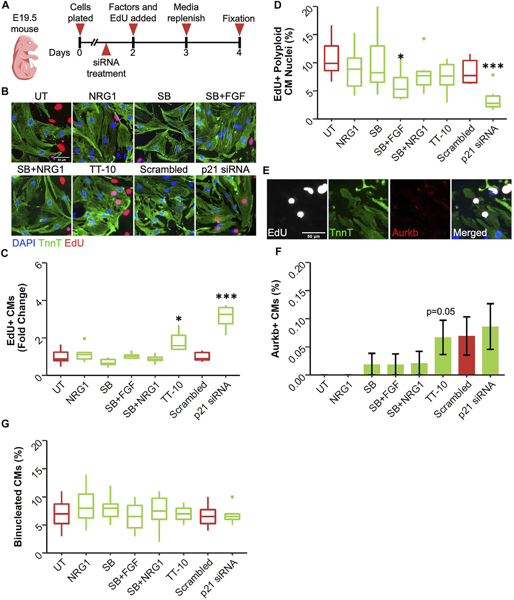 Effect of proliferative stimuli on mouse E13.5 cardiomyocytes. (A) Experimental outline. E13.5 mouse cardiomyocytes were isolated and plated on Day 0, 36 h later siRNAs and 48 h later proliferative stimuli were added. Edu was added along with proliferative stimuli and was present for the last 48 h of culture. (B) Representative images of E13.5 murine cardiomyocytes stained for TnnT (green), EdU (Red) and DAPI (blue) (scalebar = 50 µm) (C) Quantification of Fold Change in relative EdU + CM nuclei (n = 6 for each group, **p < 0.01, ***p < 0.001) (D) Quantification of EdU + polyploid (4n+) nuclei based on DAPI histograms (n = 6, *p < 0.05, ***p < 0.001) (E) Representative image of Aurkb + cardiomyocyte in the process of undergoing cytokinesis (F) Abundance of Aurkb + CMs relative to total number of CMs after treatments (n = 6 for each group, *p < 0.05) (G) Percentage of binucleated CMs at the end of culturing period (n = 6 for each group).