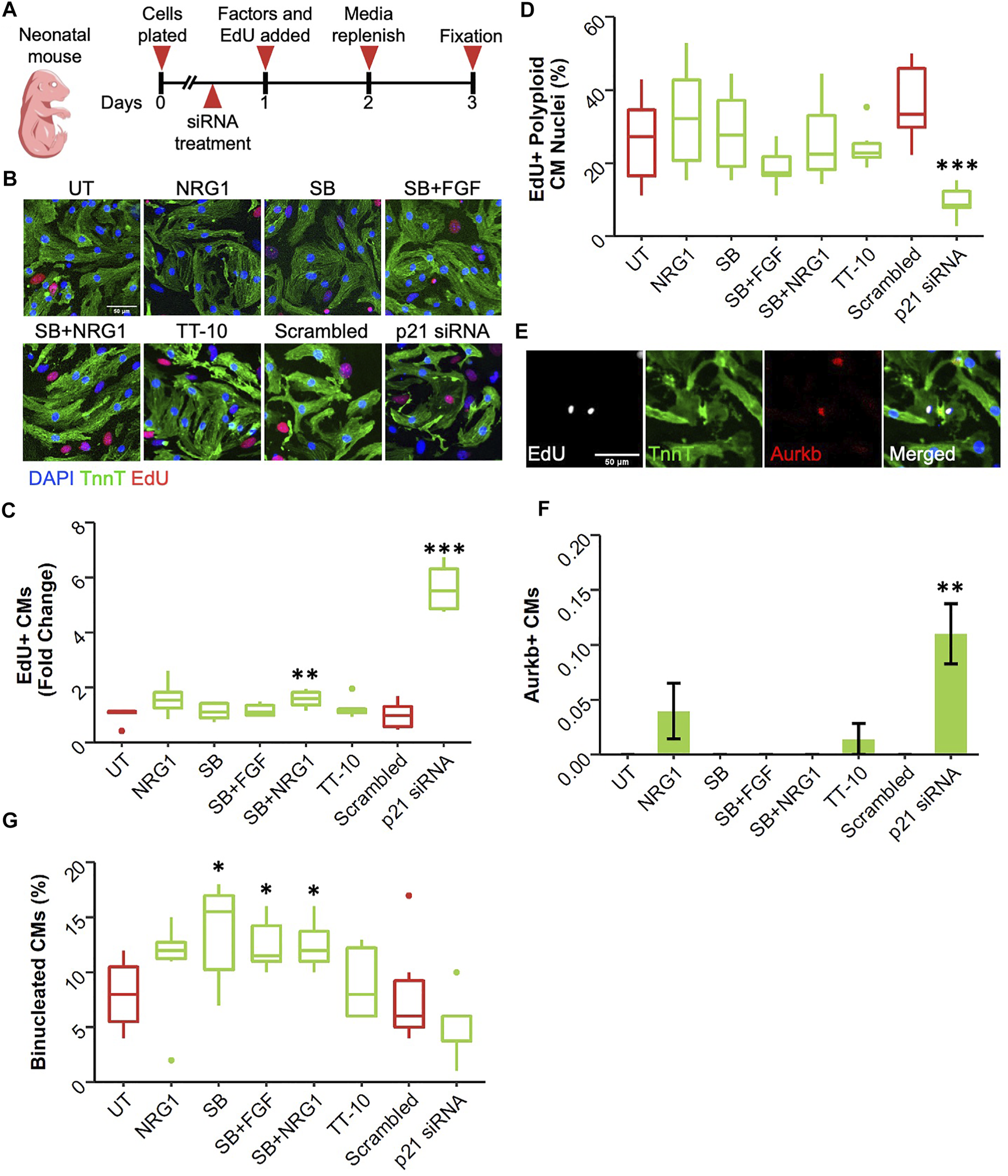 Effect of proliferative stimuli on neonatal mouse cardiomyocytes. (A) Experimental outline. Neonatal mouse cardiomyocytes were isolated and plated on Day 0, 36 h later siRNAs and 48 h later proliferative stimuli were added. Edu was added along with proliferative stimuli and was present for the last 48h of culture. (B) Representative images of neonatal mouse cardiomyocytes stained for TnnT (green), EdU (Red) and DAPI (blue) (scalebar = 50 µm) (C) Quantification of Fold Change in relative EdU + CM nuclei (n = 6 for each group, *p < 0.05, ***p < 0.001) (D) Quantification of EdU + polyploid (4n+) nuclei based on DAPI histograms (n = 6, *p < 0.05, ***p < 0.001) (E) Representative image of Aurkb + cardiomyocyte in the process of undergoing cytokinesis (F) Abundance of Aurkb + CMs relative to total number of CMs after treatments (n = 6 for each group) (G) Percentage of binucleated CMs at the end of culturing period (n = 6 for each group).