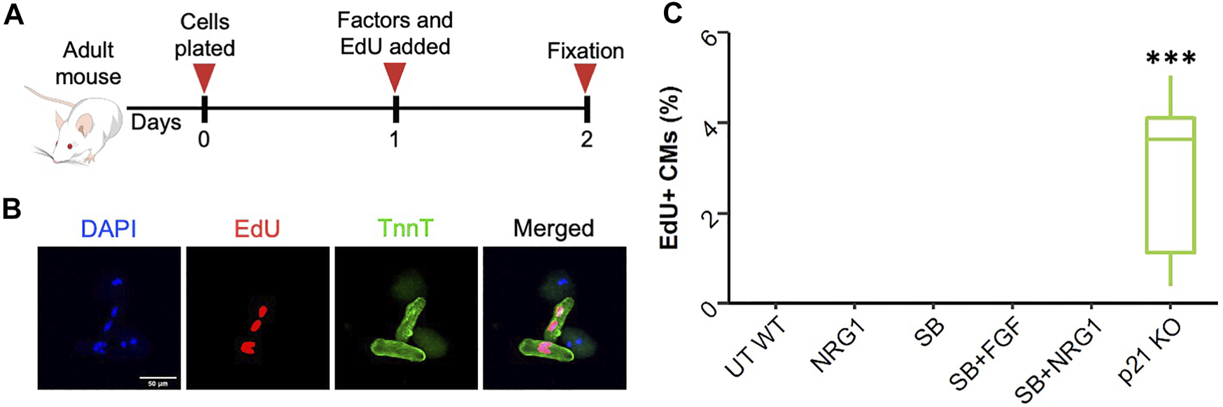 Adult cardiomyocytes were isolated from 3-month old C57Bl/6j or p21KO animals (JAX stock #016565) as previously described (Deng et al., 1995; Ackers-Johnson and Foo, 2019). Cardiomyocytes were seeded on laminin (Thermo Fisher Scientific, 23017015) coated 96-wells plates and cultured for 24 h before introducing EdU. Cells were then cultured for an additional 24 h, fixed and stained for EdU, DAPI and troponin T.