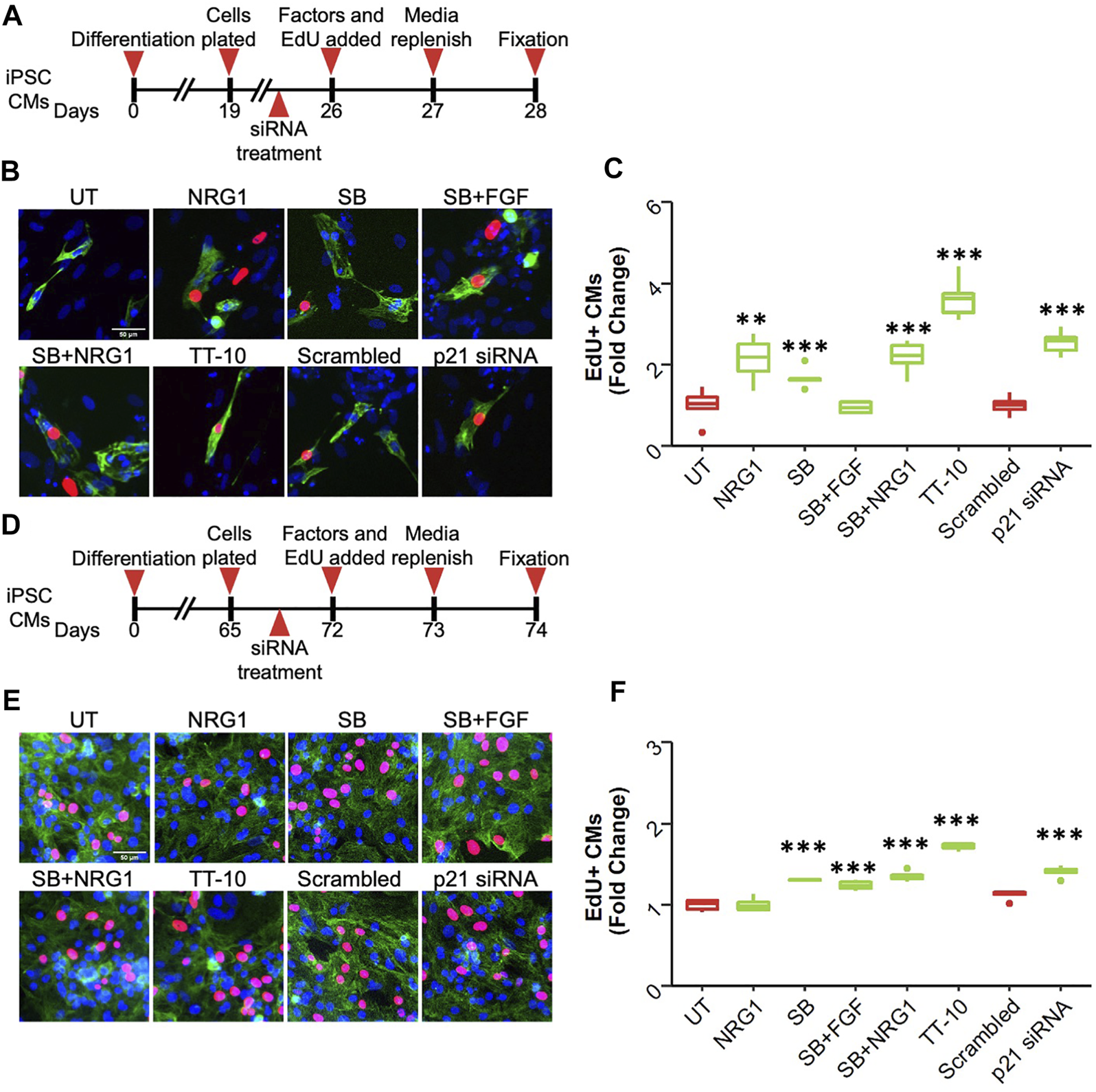 For our study, we used Cdkn1a inhibition, TT-10, Neuregulin-1, MAPK p38 inhibitor SB203580, and its combinations with both Neuregulin-1 and FGF-1 as proliferative stimuli. We first tested these approaches using neonatal rat ventricular cardiomyocytes. All stimuli enhanced cardiomyocyte cell cycle activity to a similar degree measured by both S phase and mitotic entrance using EdU and pHH3, respectively. Of note, the observed levels of phosphorylated histone H3 were much lower compared with EdU incorporation rates. This is likely a reflection of the cumulative nature of EdU incorporation compared with the transitory phosphorylation of Histone H3 at the onset of mitosis, combined with the longer duration of S-phase, ∼8 hrs, vs. G2/M, ∼4 h. Another potential explanation for this difference could be a cessation of cell cycle progression to mitosis despite completion of DNA synthesis (G2 arrest). Live cell imaging showed that the level of completion of mitosis varied considerably. In rat neonatal cardiomyocytes, only p21 inhibition was able to stimulate cardiomyocyte mitosis, which was further corroborated by enhanced Cyclin A and B expression only when p21 was knocked down, although we did not test TT-10 using live-cell imaging.