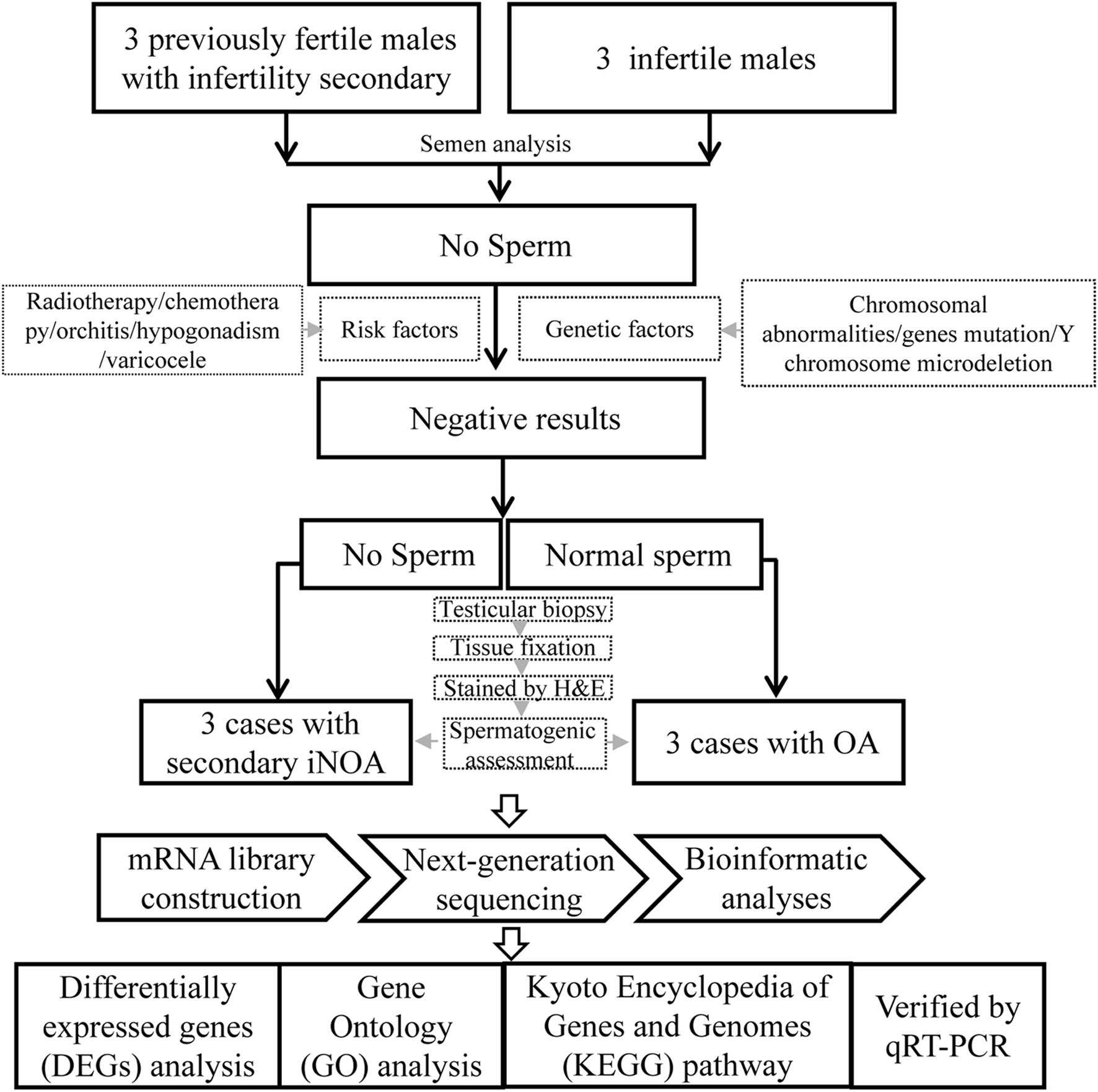 Three patients with “secondary iNOA” and infertility were recruited as the case group, and three patients with OA as controls from the First Affiliated Hospital of Anhui Medical University. All the six patients underwent testicular biopsy. A small piece of testicular tissue was fixed and stained to assess the spermatogenic function. Another piece of tissue was frozen immediately and then mRNA sequencing was performed. Further bioinformatic analyses were performed to select differentially expressed genes (DEGs), and conduct Gene Ontology (GO) and Kyoto Encyclopedia of Genes and Genomes (KEGG) pathway enrichment analyses. The expression of some important DEGs selected were determined through quantitative reverse transcription polymerase chain reaction (qRT-PCR) to indicate the potential molecular basis of this disease. The experimental design flowchart of this study is summarized in Figure 1.