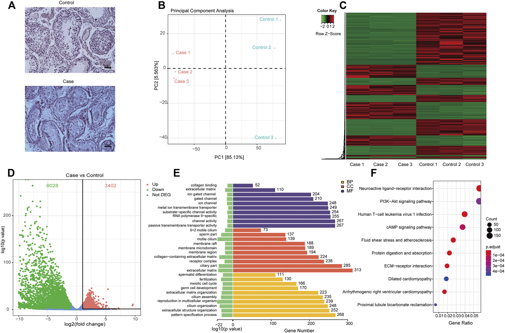 Differentially expressed genes and their related functions. (A) H&E staining of testicular tissue; (B) principal component analysis of expressed genes distinguish cases and controls; (C) heatmap and phylogenetic tree of differentially expressed genes; (D) the differentially expressed genes. Red dots indicate significantly upregulated genes in cases. Green dots indicate significantly downregulated genes in cases and that the genes were not significantly differentially expressed in cases were indicated by blue dots; (E) gene ontology functional enrichment of significantly differentially expressed genes; (F), KEGG functional enrichment of significantly differentially expressed genes.