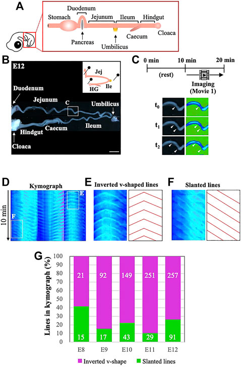 FIGURE 1. Kymography reveals that bidirectional waves are predominant in embryonic gut peristalsis, at least until E12. (A) The segment of gut located posteriorly to the stomach is dissected from an embryo, and (B) placed into a Petri dish with gentle holding with pins to avoid dislocation of the specimen. (C) The specimen is video recorded for 10 min following 10 min of rest in a dish, and subsequently subjected to digital processing with ImageJ so that peristaltic movements can be visualized by changes in colors. The photos, showing an origin and the propagating waves, are three frames extracted from Supplementary Video S1 at the portion indicated in a square in B. (D) Digital images are further processed to make kymographs. Periodic propagation of peristaltic waves is represented by repeated lines along the time period of 10 min (E, F) If the propagation of a wave is bidirectional which is accompanied by an origin, it is shown in the kymograph as an inverted v-shape with an apex (E), whereas unidirectionally propagating waves are represented simply by slanted lines without an apex (F). (G) The majority of peristaltic waves are bidirectional in embryonic guts examined from E8 to E12. Scale bar: 4 mm.
