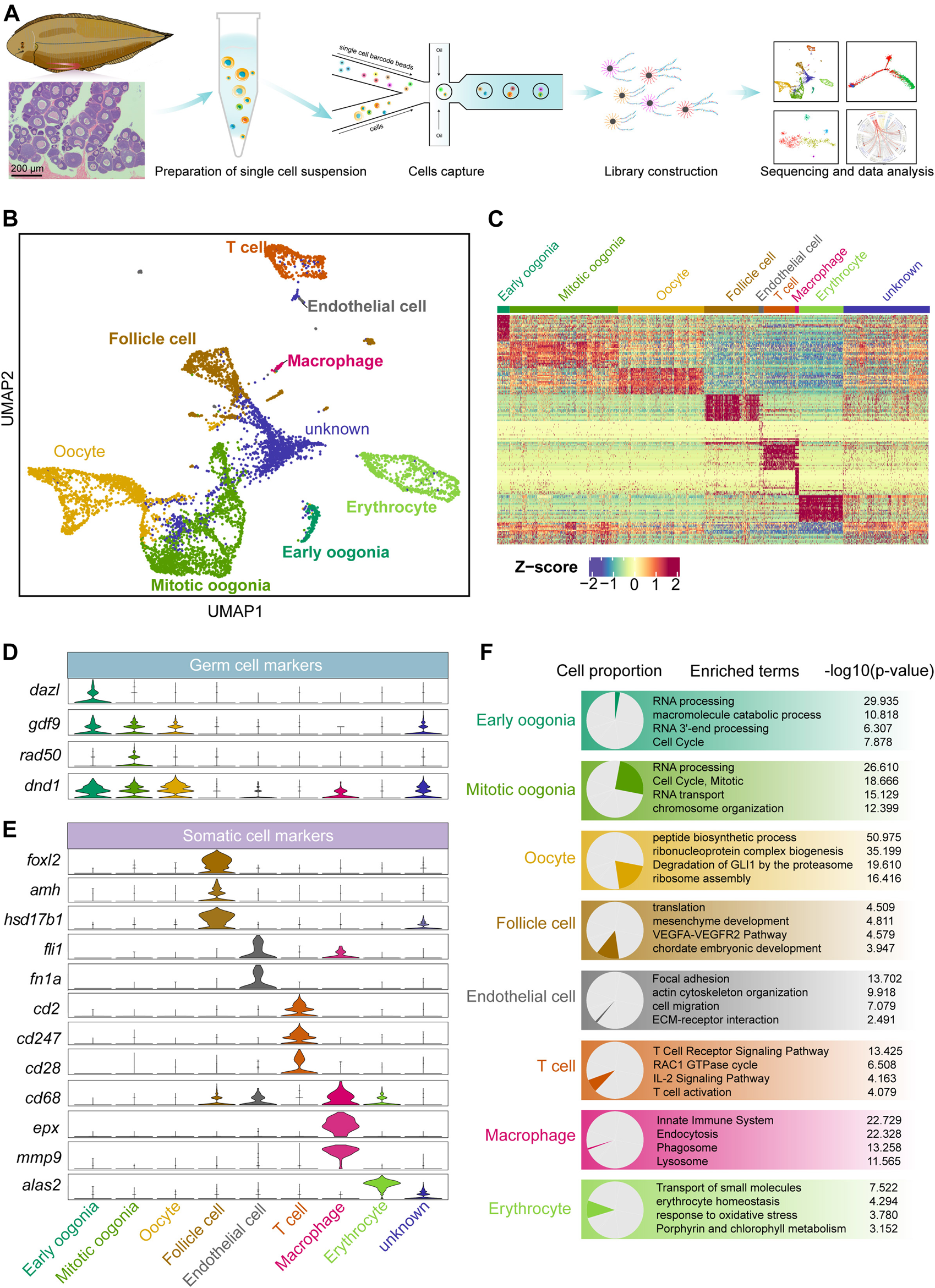 Overview of germ and somatic ovarian cell types determined by scRNA sequencing in Chinese tongue sole. (A) Schematic representation of the scRNA-seq analysis of Chinese tongue sole ovarian cells. (B) Visualization of major ovarian cell types among 7,185 cells in UMAP (unknown is undefined). Different cell types are shown in distinct colours. (C) Heatmap showing the expression of the top 20 DEGs of the main cell types. The colours from blue to red indicate low to high gene expression levels, respectively. Z-scores were calculated by subtracting the average value for the set of data from the value for each cell and dividing by the standard deviation. (D) Violin plots of the normalized expression of marker genes in the three germ cell types. (E) Violin plots of the normalized expression of marker genes in the five somatic cell types. (F) Enriched terms of DEGs are shown for ovarian cell types (p-values are shown). The proportion of each cell type is shown on the left.