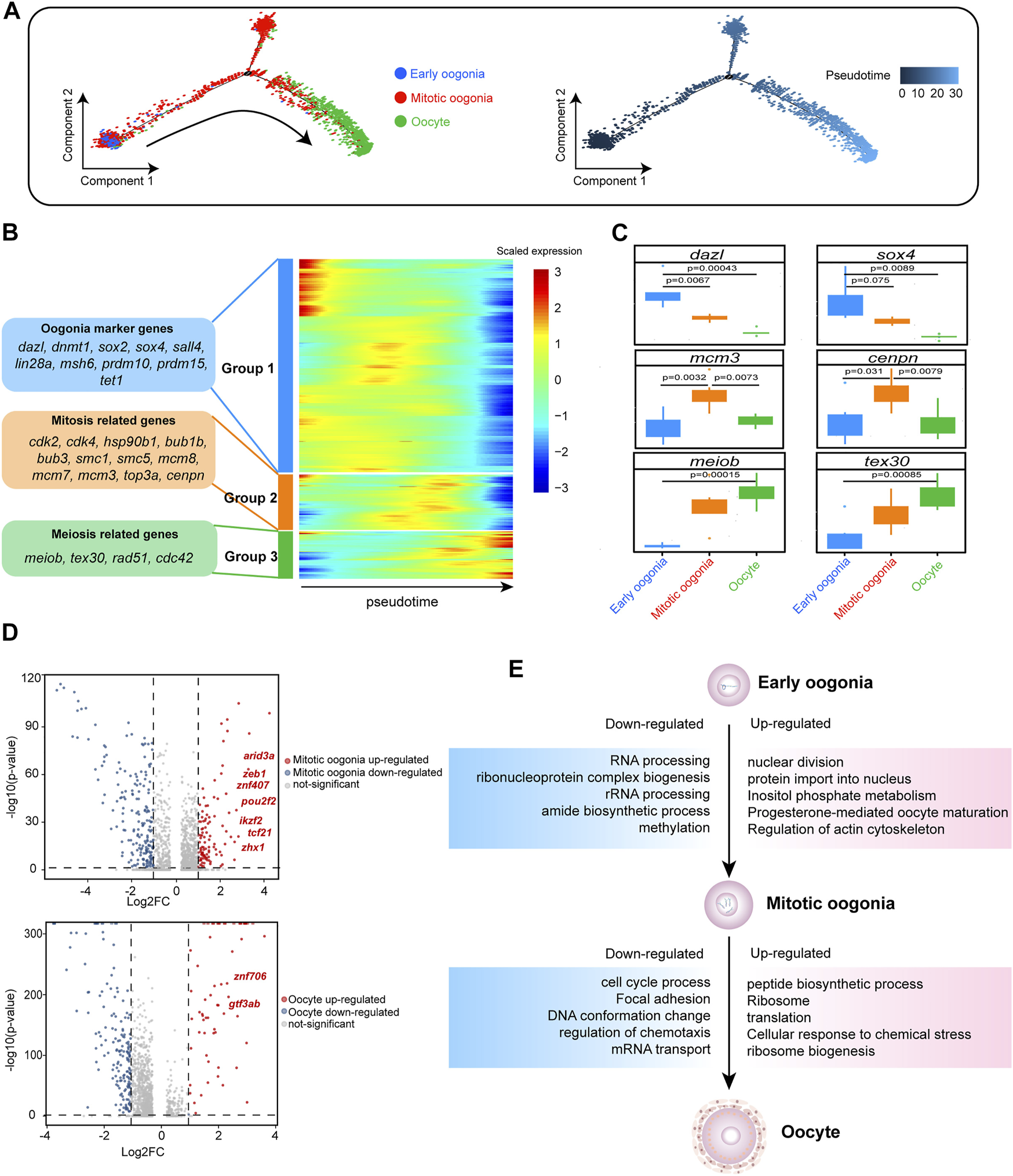Gene expression dynamics and transcriptional characteristics of ovarian germ cells. (A) Developmental pseudotime trajectory of germ cells. Different colours in the figure on the left side represent different cell types. The figure on the right represents the degree of differentiation of the cell types in the pseudotime trajectory (where darker colours indicate a lower degree of differentiation). (B) Gene expression heatmap over pseudotime. After clustering analysis, genes were divided into three groups (Groups 1–3) (representative genes are shown on the left). Colours from blue to red indicate low to high gene expression levels, respectively. (C) Boxplot showing the mean expression levels of oogenesis-associated genes in each germ cell subtype. Two-tailed t test p-values are indicated. (D) Volcano plot showing the DEGs of germ cells, setting a fold change >2 as the threshold (dotted line). In the upper figure, upregulated genes in mitotic oogonia relative to early oogonia are indicated in red, and downregulated genes are indicated in blue. In the lower figure, upregulated genes in oocytes relative to mitotic oogonia are indicated in red, and downregulated genes are indicated in blue. Upregulated transcription factors (TFs) are labelled. (E) DEGs and associated enriched terms (identified using Metascape) characteristic of germ cell developmental transitions, based on Figure 2D. Upregulated terms are annotated in pink boxes, and downregulated terms are annotated in blue boxes.