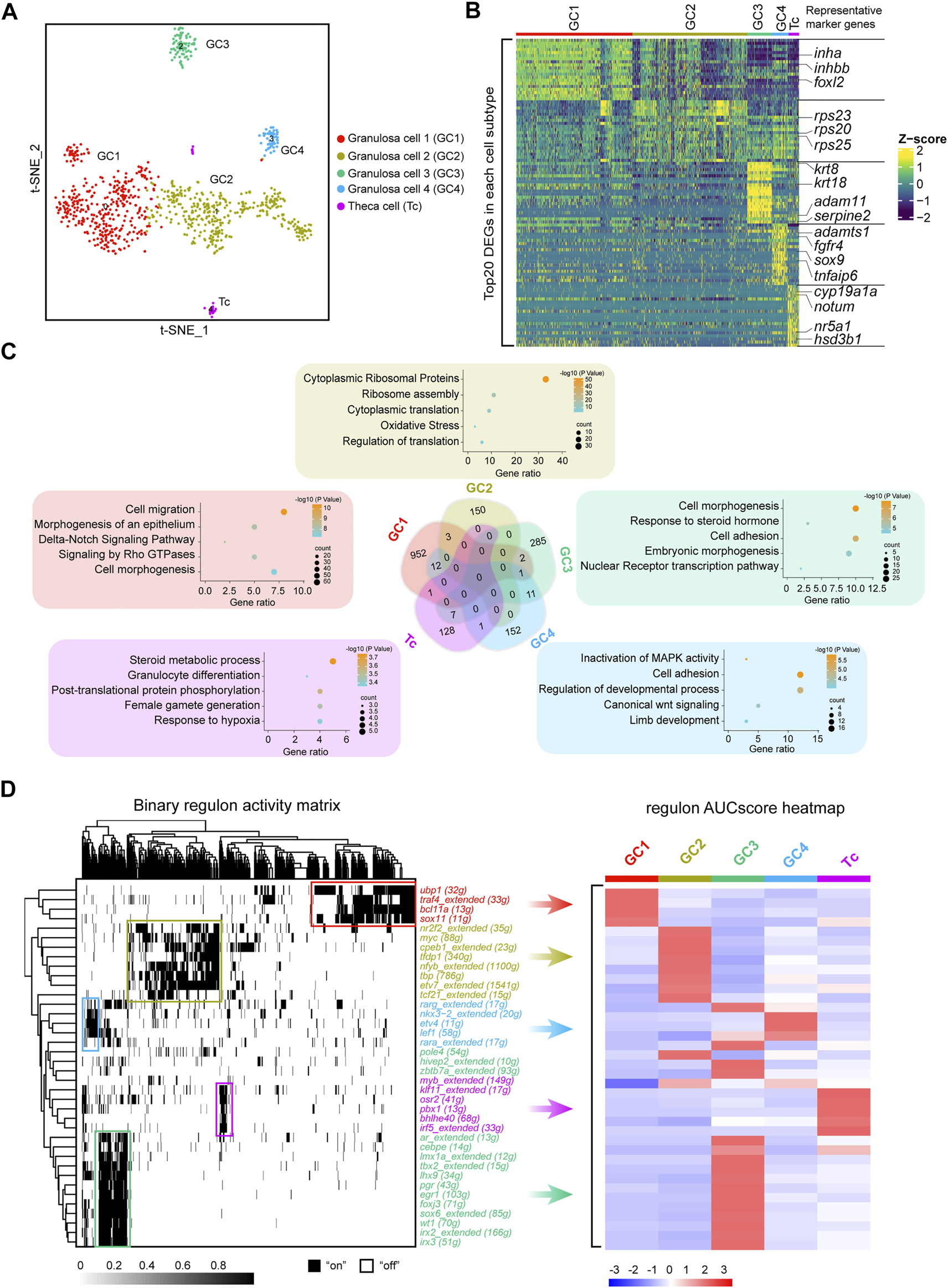 Identification of five discrete transcriptional states of follicle cells. (A) UMAP of follicle cell re-clustering. (B) Heatmap of the top 20 DEGs in different subclusters of follicle cells. The colours from dark blue to yellow indicate low to high gene expression levels, respectively. Representative marker genes are shown in right. (C) Venn diagram showing the intersection of DEGs of the five subclusters. Representative enriched terms for DEGs are shown. (D) Left: SCENIC binary regulon activity heatmap depicting follicle cell-enriched regulons. “On” indicates active, while “Off” indicates inactive; Right: Heatmap of the AUC scores of follicle cell subtype-specific regulons. The regulons correspond to the graph on the left.