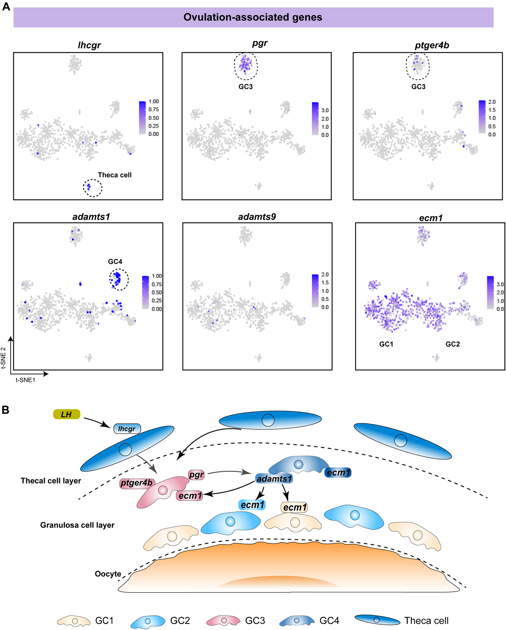To investigate the functions of different follicle cell subtypes in fish ovulation, we analysed the expression of pivotal genes in ovulation. Our data showed that lhcgr, the LH receptor, was specifically expressed in theca cells, indicating that theca cells receive and transmit LH stimulation during ovulation (Figure 5A). This is consistent with previous studies in mammals and fish (Curry, 2010; Takahashi et al., 2018). Additionally, pgr and ptger4b, the receptors of progesterone and prostaglandin E2, were highly expressed in GC3, suggesting that progesterone and prostaglandin mainly affect fish ovulation through GC3 (Figure 5A). Adamts1 and adamts9 have been reported to be associated with follicle rupture in mammals, especially adamts1, which is a protein lyase proven to play an important role in ovulation in a gene knockout experiment (Shozu et al., 2005; Brown et al., 2006). We found that adamts1 was predominantly expressed in GC4, whereas adamts9 was expressed in only a few cells (Figure 5A). This suggests that adamts1 secreted by GC4 might promote follicular rupture during fish ovulation. Notably, ecm1 was expressed in all subtypes, indicating that adamts1 acts on the extracellular matrix proteins of distinct granulosa cells to induce different biological changes in the follicle wall (Figure 5A). Taken together, our results suggest that fish ovulation is based on the synergistic action of diverse granulosa cells and theca cells (Figure 5B).