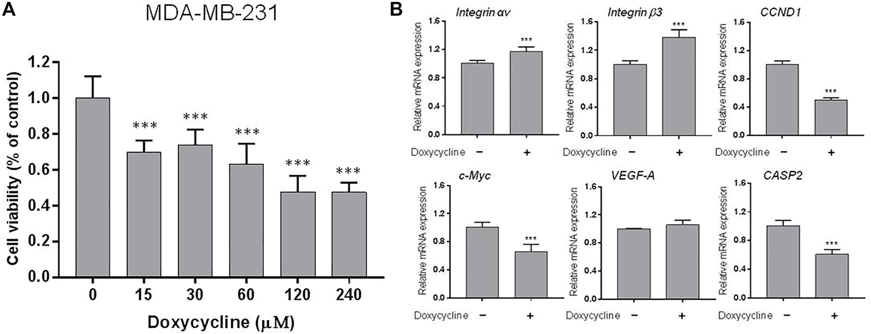 Similar studies were performed in triple negative breast cancer MDA-MB-231 cell line. MDA-MB-231 cells were harvested and total RNA was extracted after treatment with doxycycline (60 μM) for 24 h. The qPCR was conducted for integrin αv, integrin β3, CCND1, c-Myc, VEGF-A, CASP2 (Figure 2B). Doxycycline treatment inhibited the expression of CCND1 and c-Myc in MDA-MB-231 cells. Instead, doxycycline treatment did not suppress the expression of integrin αv, β3, and VEGF-A in MDA-MB-231 cells. On the other hand, doxycycline increased the expression of integrin αv and integrin β3 (Figure 2B). Moreover, doxycycline-induced gene expressions of integrin αvβ3 displayed different patterns between MCF-7 and MDA-MB-231 cells. These results indicated that doxycycline might promote different pathways to induce anti-cancer growth in ER-positive and ER-negative breast cancer cells. The antiproliferative effect demonstrated that the cell viability of ER-negative breast cancer MDA-MB-231 cells was lower than that of doxycycline-treated MCF-7 cells (Figures 1A, 2A).
