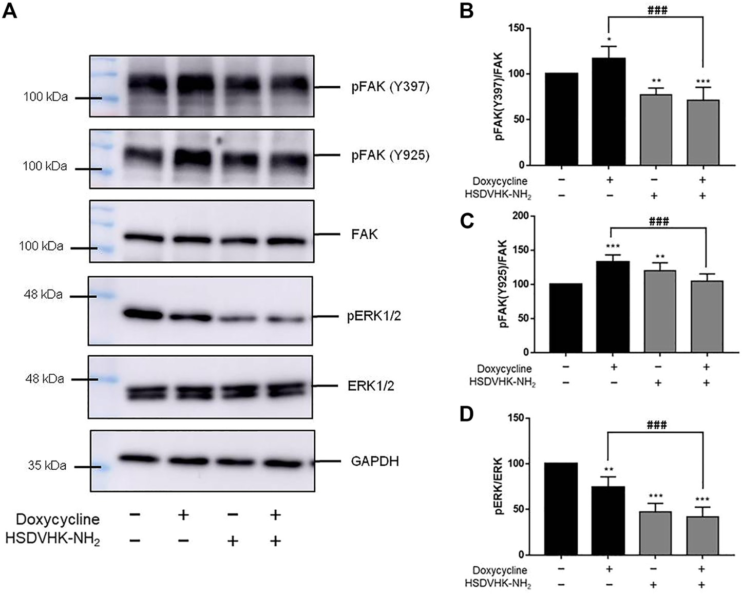 Blockage of integrin αvβ3 activity inhibits doxycycline-induced signal transduction in breast cancer MDA-MB-231 cells. (A) Cells were pre-treated with HSDVHK-NH2 (10 µM) for 24 h, then treated with doxycycline (60 µM) for 24 h. Cells were harvested and protein was extracted for Western blotting analysis of pFAK (Y397), pFAK (Y925), FAK, pERK1/2, and total ERK1/2. The HSDVHK-NH2 compound reduced doxycycline-induced phosphorylation of Y397 (B), Y925 (C), and pERK1/2 (D). Numbers of independent studies (n) = 3. ANOVA was used to assess statistical significance. *p < 0.05, **p < 0.01, ***p < 0.001, compared to the untreated control. ###p < 0.001, compared to doxycycline alone.