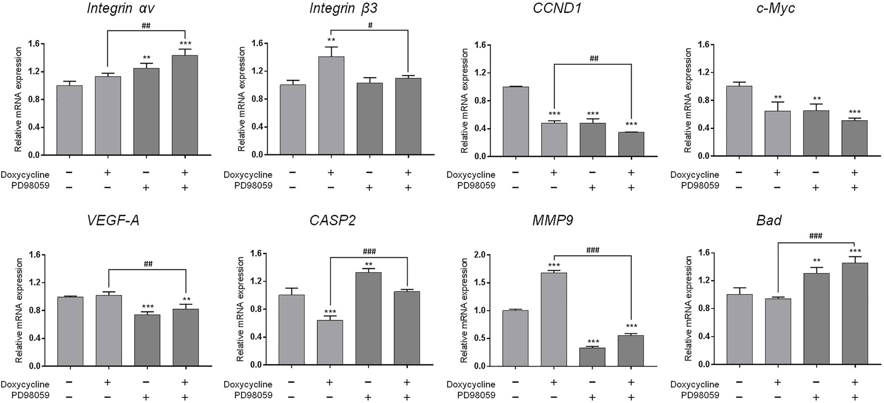 Since our findings (Figure 3) and others had shown that doxycycline inhibited ERK1/2 activation, we further investigated the role of the ERK1/2-dependent signal transduction pathway in doxycycline-induced biological activities in breast cancer MDA-MB-231 cells. MDA-MB-231 cells were treated with 60 µM doxycycline in the presence or absence of an ERK1/2 inhibitor, PD98059 (25 µM) for 24 h. Cells were harvested and total RNA was extracted for qPCR (Figure 5). The results are similar to Figure 4. Doxycycline inhibited CCND1 and c-Myc in MDA-MB-231 cells, whereas integrin αv, integrin β3, VEGF-A, MMP-9, and Bad were not suppressed. These results were consistent with pre-treatment of HSDVHK-NH2. In addition, the gene expressions of integrin β3, the proliferative genes (CCND1), the angiogenic gene (VEGF-A), and the migration-related gene (MMP9) were further inhibited by PD98059 significantly. However, the pro-apoptotic gene (CASP2 and Bad) was significantly activated by PD98059. These results indicate that activated ERK1/2 is involved in doxycycline-induced gene expressions.