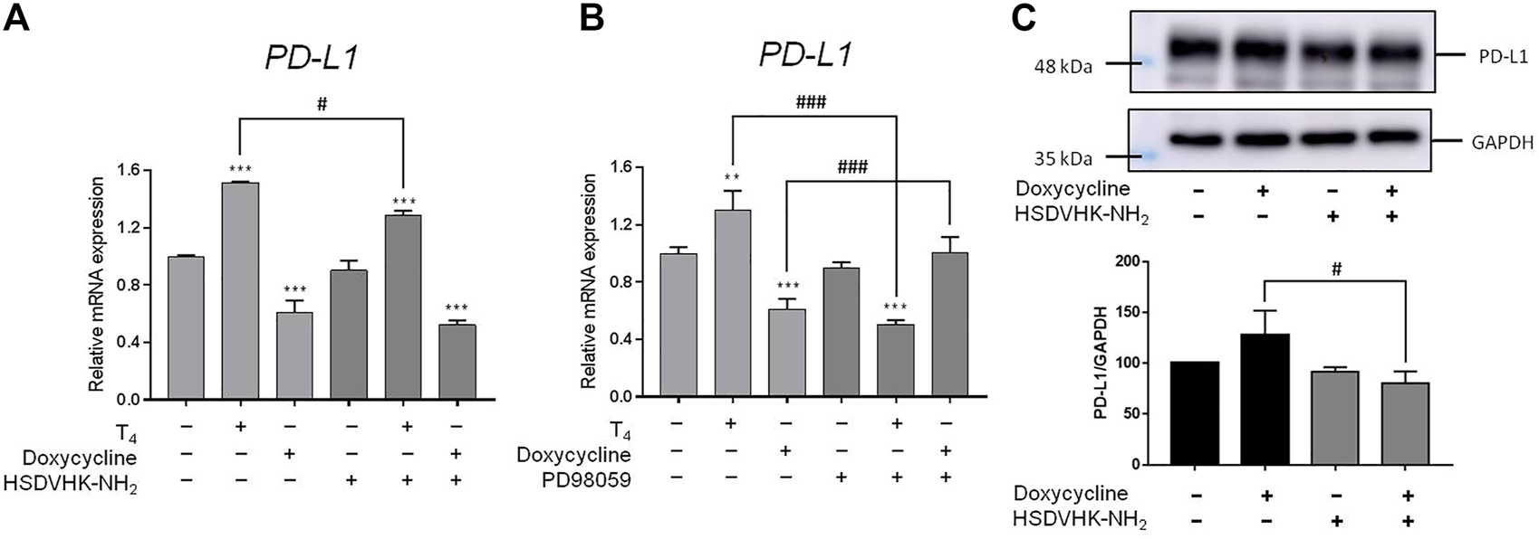 Integrin αvβ 3 and ERK1/2 collaborate to thyroxine- or doxycycline-induced PD-L1 expression in breast cancer MDA-MB-231 cells. MDA-MB-231 cells were pre-treated with (A) HSDVHK-NH2 (10 µM) or (B) PD98059 (25 µM) for 24 h, then treated with T4 (100 nM) or doxycycline (60 µM) for 24 h. Cells were harvested. RNA was extracted for qPCR. Numbers of independent studies (n) = 3. ANOVA was used to assess statistical significance. **p < 0.01, ***p < 0.001, compared to the untreated control. #p < 0.05, ###p < 0.001, compared to doxycycline or T4 treatment alone. (C) MDA-MB-231 cells were pre-treated with HSDVHK-NH2 (10 µM) for 24 h, then treated with doxycycline (60 µM) for 24 h. Cells were harvested and protein was extracted for PD-L1 expression analysis. Numbers of independent studies (n) = 3. ANOVA was used to assess statistical significance. #p < 0.05, compared to doxycycline alone.