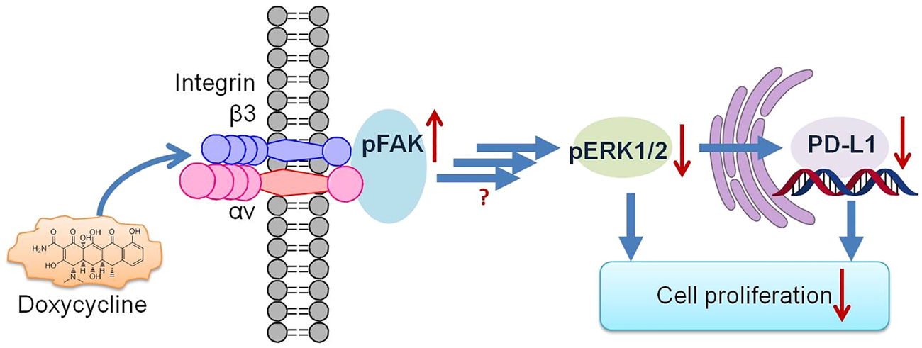 Early studies demonstrate that doxycycline is highly lipophilic, hence it can penetrate the cell membrane and enter cells to inhibit the synthesis of 30S ribosomal subunits in bacteria (Chopra and Roberts, 2001). In the present study, we investigated the role of doxycycline-induced anti-proliferation in both estrogen receptor (ER)-positive (MCF-7) and ER-negative (MDA-MB-231) breast cancer cell lines. In contrast to the antibiotic activity of doxycycline, it inhibits the activation of extracellular signal-regulated kinase 1/2 (ERK1/2) and regulates genes that regulate cell proliferation by interacting with cell surface integrin αvβ3 in ER-negative breast cancer cells. On the other hand, thyroxine (T4)-induced cancer proliferation is also moderated by integrin αvβ3, which regulates ERK1/2 activation and gene expressions. Additionally, the ERK1/2 activation is associated with the PD-L1 expression. In contrast to T4, the PD-L1 gene expression is suppressed by doxycycline. The doxycycline-induced signal transductions via integrin αvβ3 play pivotal modulators in several gene expressions and anti-proliferation in breast cancer cells.