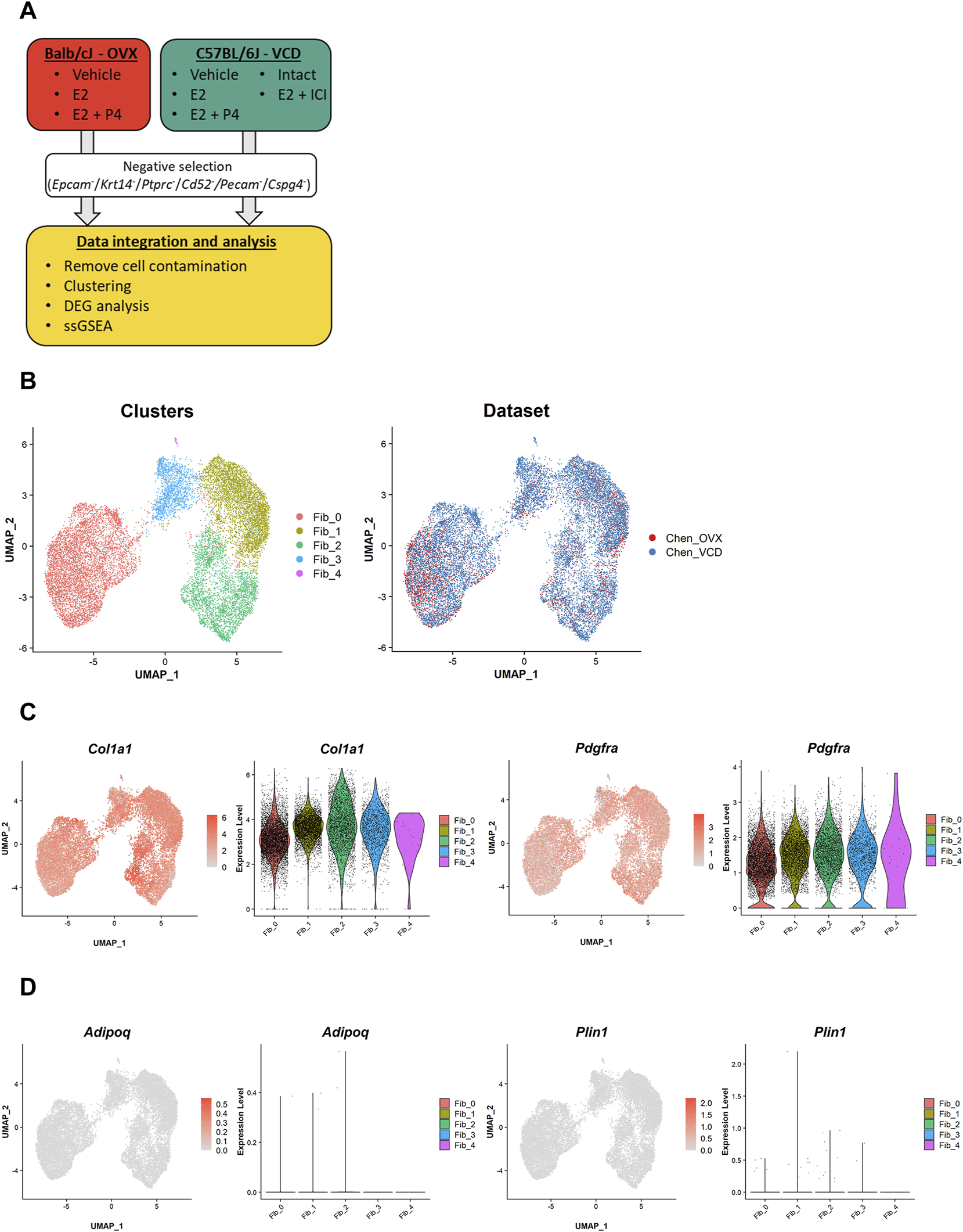 FIGURE 1. Our scRNA-seq datasets identify two major clusters of mammary gland fibroblasts commonly existing in the two different mouse models. (A) The schematic diagram of data processing and analyses for our own scRNA-seq datasets from the OVX and VCD models. The single-cell data were corrected from the mammary glands of the two models. Then, mammary gland fibroblasts were sorted by negative selection (i.e., sorting for cells without read counts for Epcam, Krt14, Ptprc, Cd52, Pecam1, and Cspg4). After the additional removal of a small fraction of cell contamination from other lineages of cells, the fibroblast dataset was integrated and evaluated in the downstream analyses (i.e., clustering, DEG analysis, and ssGSEA scoring). (B) The UMAP plot of the integrated dataset. Each cell is represented by a dot (n = 16,197) and is colored according to the cluster identified by the unbiased clustering (left) and the originated datasets (right). (C) The expression of the fibroblast markers (Col1a1 and Pdgfra) and (D) the mature adipocyte markers (Adipoq and Plin1). Each feature plot on the left panel shows the distribution of the marker-expressing cells with color indicating the expression level. Each violin plot on the right panel shows the expression level of each gene in each cluster.