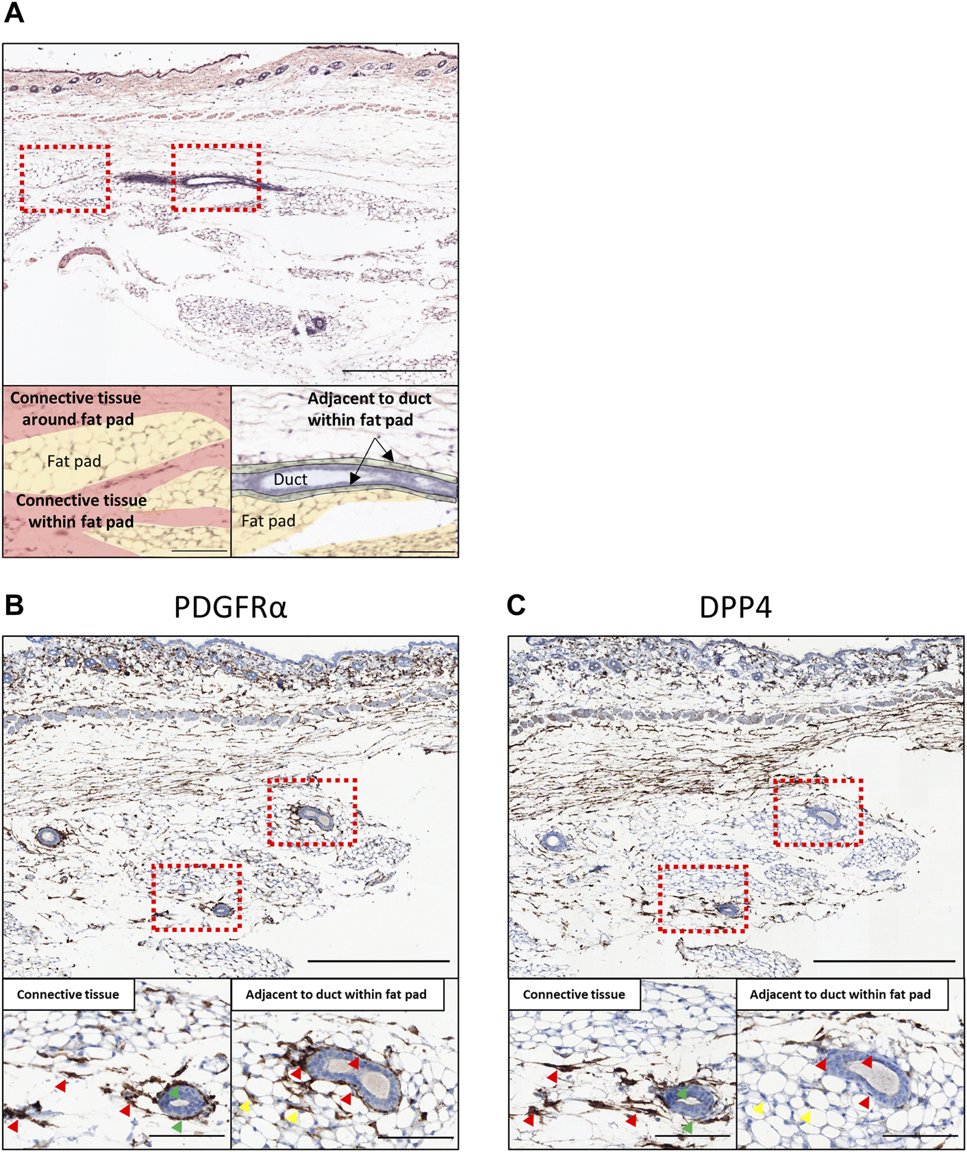 FIGURE 3. Histological evaluation in normal mouse mammary gland tissues. (A) The H&E staining of the normal mouse mammary gland. The bottom panels are colored according to histological annotation as indicated. (B,C) The immunohistochemical staining of normal mouse mammary gland for (B) PDGFRα and (C) DPP4. The mammary glands of eight-week-old C57BL/6J mice were collected together with skin (at the top part of the images) and cross-sectioned. The upper panels show the entire images of the mammary glands at low magnifications. The lower panels show the magnified images of the boxed area for the connective tissue region around/within the mammary fat pad (left) and the region adjacent to mammary gland ducts within the fat pad (right). Red arrowheads indicate the representative staining pattern of each fibroblast type for each target. Green arrowheads indicate the representative cells of PDGFRα+/DPP4+ around the mammary gland ducts going through the connective tissue region. Yellow arrowheads indicate the representative cells among the adipose tissue for each target. Scale bar = 500 μm (upper) and 100 μm (lower).