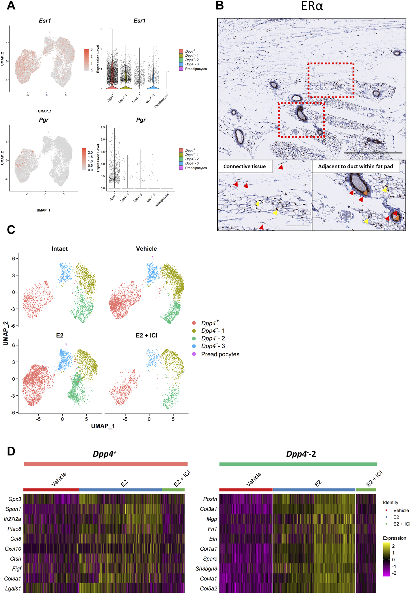 FIGURE 4. Estrogen treatment affects the gene expression profiles of the Dpp4+ and Dpp4--2 fibroblasts in an indirect and population-specific manner. (A) The expression of the ovarian hormone receptors (Esr1 and Pgr). Esr2 expression was not detected in the dataset. Each feature plot on the left panel shows the distribution of the marker-expressing cells with color indicating the expression level. Each violin plot on the right panel shows the expression level of each gene in each cluster. (B) The immunohistochemical staining for ERα in the normal mouse mammary gland. The mammary glands of eight-week-old C57BL/6J mice were collected together with skin (at the top part of the images) and cross-sectioned. The upper panels show the entire images of the mammary glands at low magnifications. The lower panels show the magnified images of the boxed area for the connective tissue region around/within the mammary fat pad (left) and the region adjacent to the mammary gland ducts within the fat pad (right). Red arrowheads indicate the representative staining pattern of each fibroblast type. Yellow arrowheads indicate the positive staining in the cells among the adipose tissue. Orange arrowheads indicate the positive staining in the mammary luminal epithelial cells. Scale bar = 500 μm (upper) and 100 μm (lower). (C) The UMAP plot for the cells from each treatment group. “Intact” (top left) and “E2 + ICI” (bottom right) includes the cells from the intact (Intact) and E2+ICI group (VCD_E2_ICI) of the VCD model, respectively. “Vehicle” (top right) includes the cells from the vehicle groups of the OVX and VCD models (OVX_vehicle and VCD_vehicle). “E2” (bottom left) includes the cells from the E2 and E2+P4 groups of the OVX and VCD models (OVX_E2, OVX_E2_P4, VCD_E2 and VCD_E2_P4). Each cell is represented by each dot and is colored according to the clusters. (D) The heatmap of the top 10 most-upregulated genes in the E2-treated cells compared to the vehicle-treated cells in the Dpp4+ and Dpp4--2 fibroblasts. Each column represents each cell and each row represents each gene. Log-normalized gene count was scaled per gene. Color bar at the top indicates the cell types (Dpp4+ fibroblasts, pink; Dpp4--2 fibroblasts, green) and treatment groups (vehicle, red; E2, blue; E2 + ICI, green).