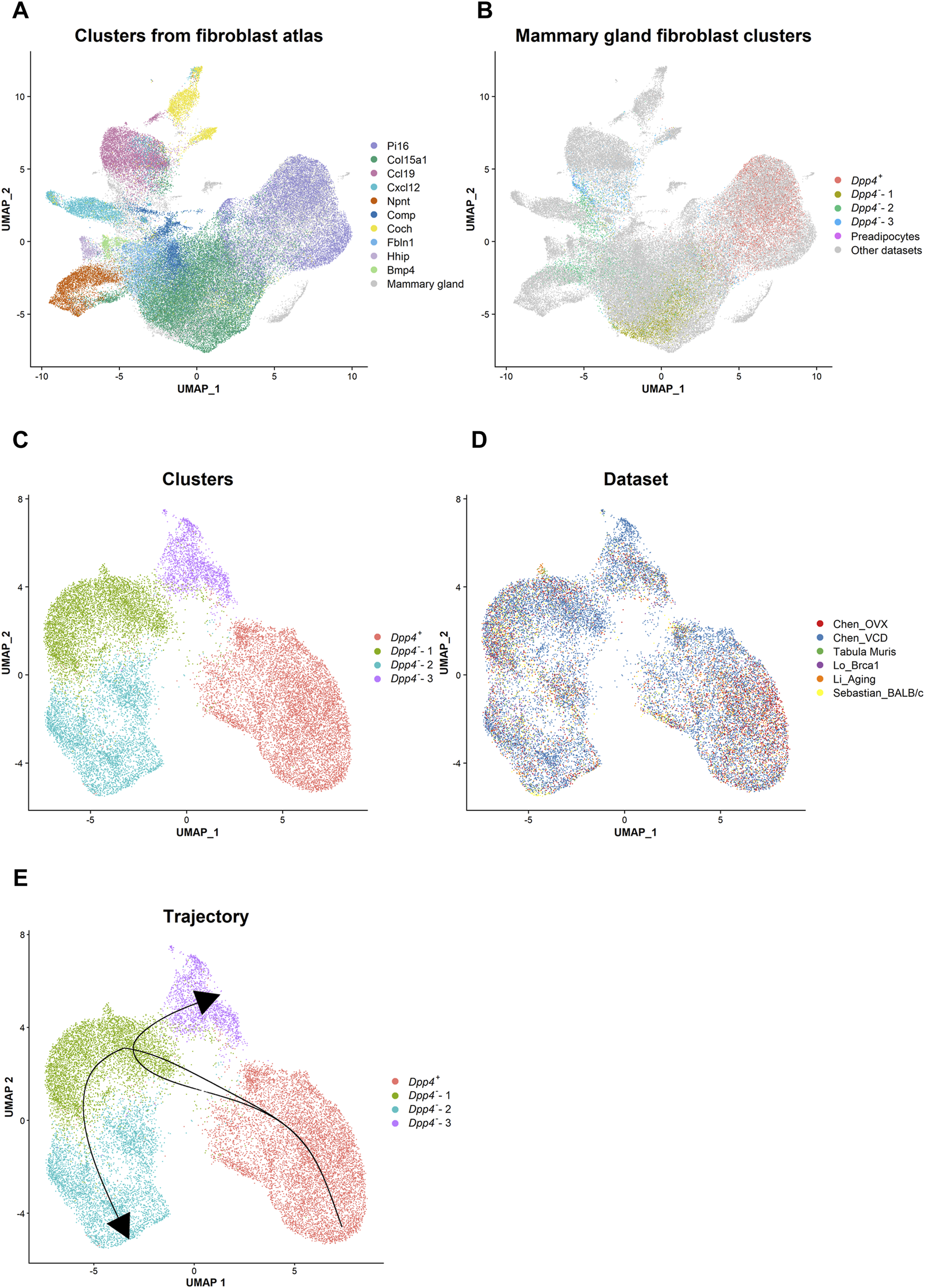 FIGURE 5. Integrative analysis reveals the lineage trajectory of mouse mammary gland fibroblasts. (A) The distribution of the steady state fibroblast clusters (Buechler et al., 2021) in the UMAP plot after the data integration with the mammary gland fibroblast datasets using the Harmony R package. Each cell is represented by each dot (n = 82,410) and is colored according to the clusters identified in the paper from Buechler et al., 2021. Mammary gland fibroblasts are colored in gray. (B) The distribution of the mammary gland fibroblast clusters identified in our own dataset in the UMAP plot. Each cell from our dataset (Chen_OVX/VCD) is represented by each dot and is colored according to the mammary gland fibroblast clusters as indicated in Figure 1B. The cells from the other datasets are colored in gray. (C,D) The UMAP plot of the integrated mammary gland fibroblast dataset. Each cell is represented by each dot (n = 21,861) and is colored according to (C) the cluster identified by the unbiased clustering and (D) the originated datasets. (E) The lineage trajectory of mammary gland fibroblasts inferred by the Slingshot R package. The principal curve was generated based on the pseudotime shown in Supplementary Figure S4C.