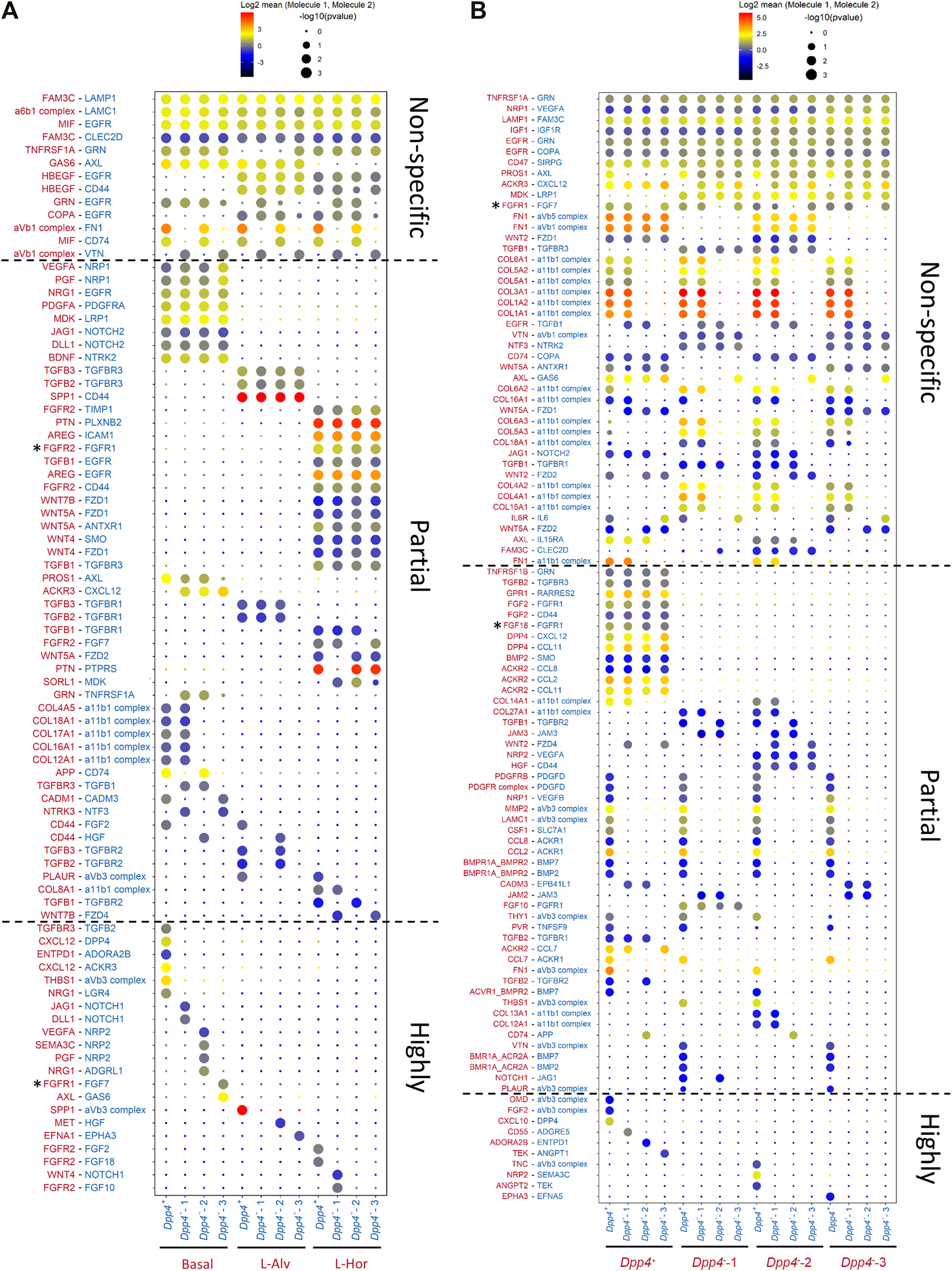 FIGURE 6. Cell-cell interaction inference. (A,B) The significant ligand-receptor pairs between (A) mammary epithelial cells and fibroblasts and (B) fibroblasts and fibroblasts. Size and color of each dot represent the p value and the level of log2 mean expression of the identified ligand-receptor pair in each row between the cell types in each column, respectively. The color of the molecules in row is matched with the cell type expressing the molecules indicated in column. The asterisks (*) represent the FGFR/FGF-related interaction pairs which were identified by the cell-cell interaction inference but were considered to be biologically improbable interactions based on the previous publications (Bellot et al., 1991; Ornitz et al., 1996; Zhang et al., 2006).