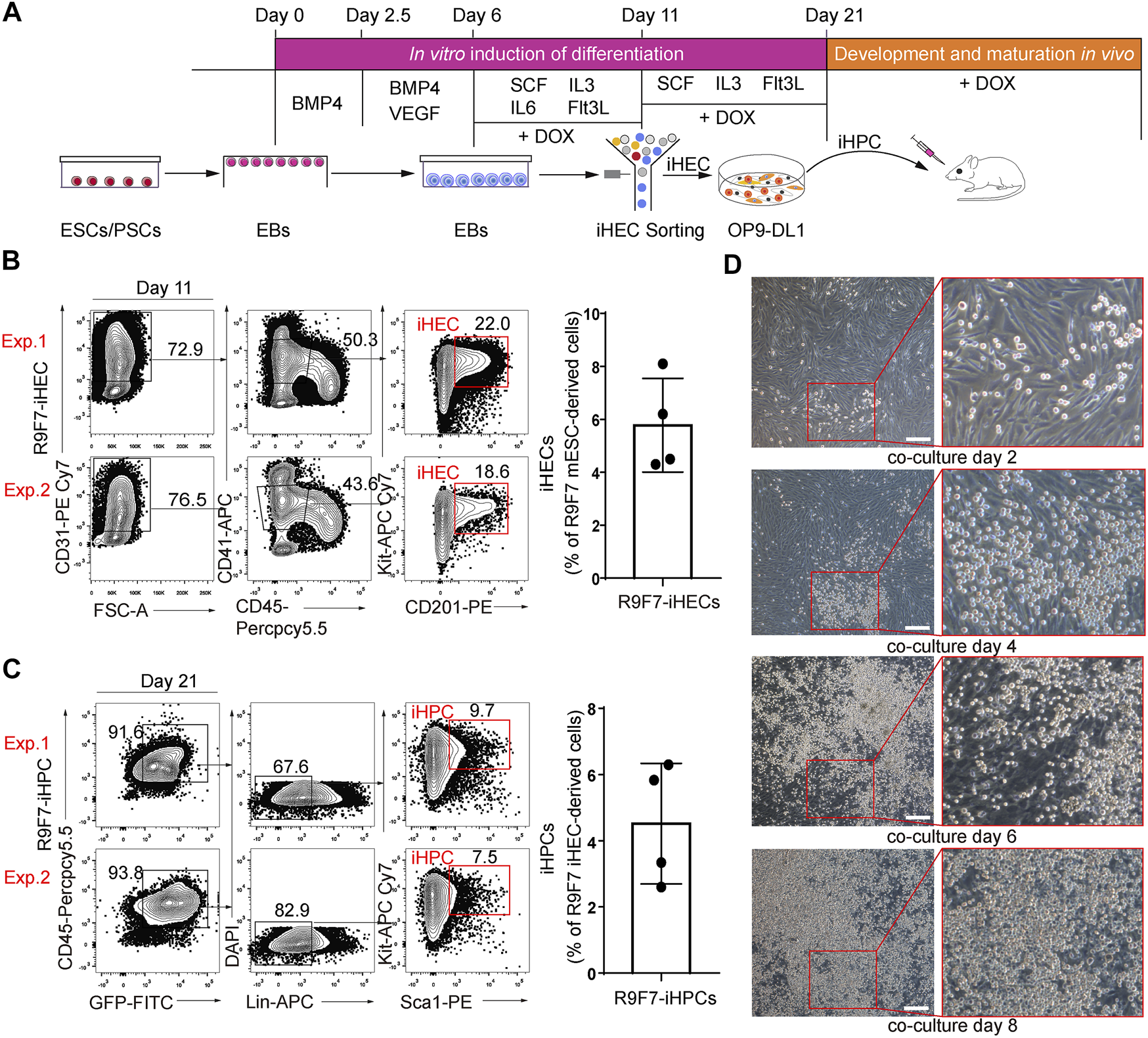 Generation of iHPCs from iR9F7-ESCs in vitro(A) schematic overview of experimental strategy of hematopoietic induction from ESCs. iHPCs were achieved through stepwise in vitro induction and multi-lineage hematopoietic differentiation potential was determined in vivo by transplantation (B) Representative flow cytometric plots (left) and graph (right) showing the composition of iHECs on day 11 of induction from iR9F7-ESCs. iHEC was defined as CD31+CD41midCD45−Kit+CD201+. Two representatives from four independent experiments are shown (C) Representative flow cytometric plots (left) and graph (right) showing the composition of iHPCs on day 10 of induction of iHECs on OP9-DL1 stromal cells. iHPC was defined as lin−Kit+Sca1+. Lin was defined as CD2−CD3−CD4−CD8−CD11b−Gr1−Ter119−CD19−NK1.1−TCRγδ−. Two representatives from four independent experiments are shown (D) Morphology of the sorted iHECs on OP9-DL1 cells on day 2, 4, 6, and 8 of co-culture, respectively. Scale bars, 200 μm.