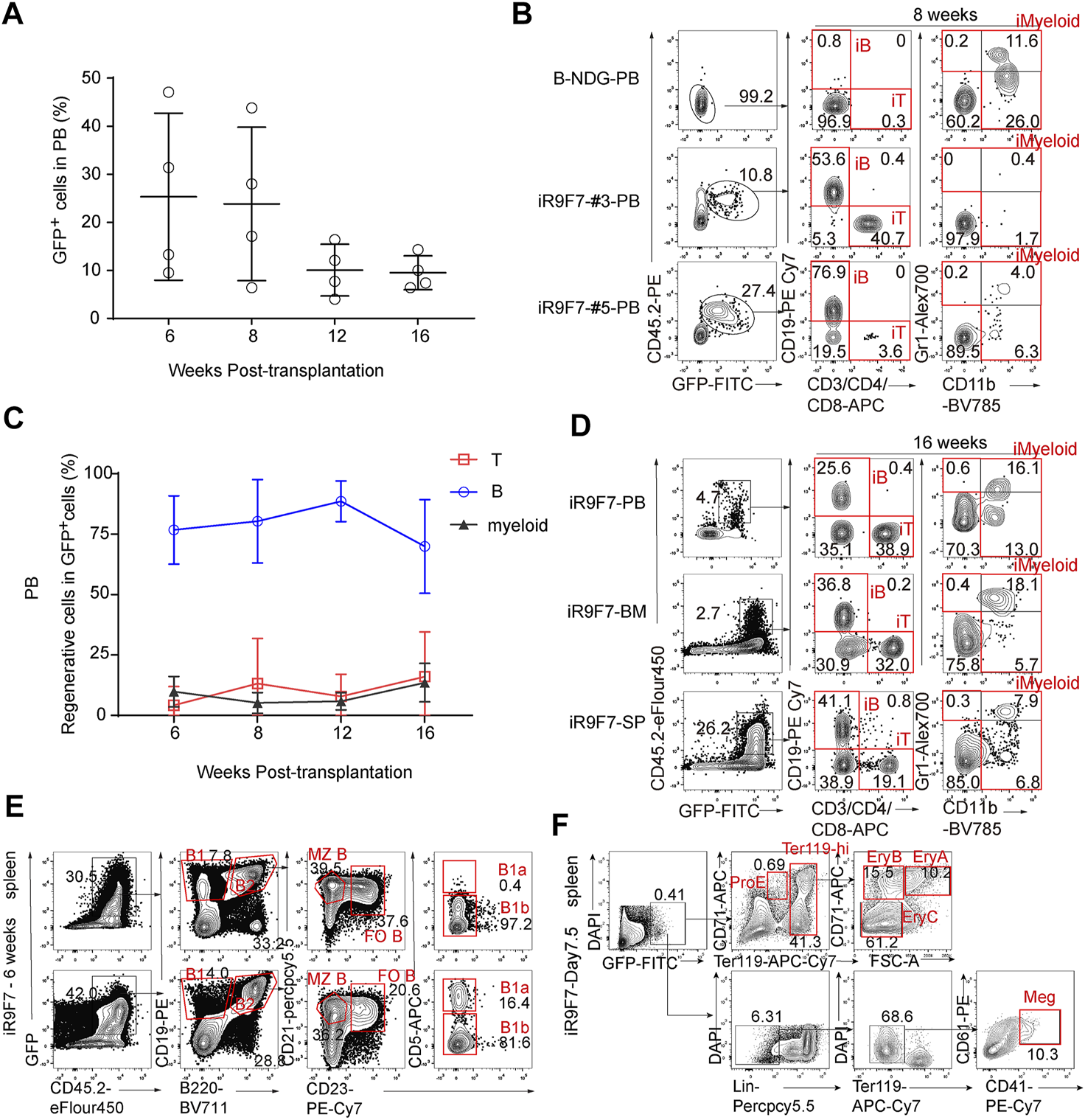 Multi-lineage contribution of R9F7-iHPCs in the recipients (A) Frequency of GFP+ cells in the peripheral blood (PB) of recipient mice (n = 4) at indicated time points post-transplantation. Three million iHEC-derived hematopoietic cells were transplanted into individual B-NDG mouse (CD45.1+) irradiated by X-ray (2.25 Gy) (B) Representative flow cytometric analysis showing donor reconstitution and lineage composition in the PB of mice transplanted with iHPCs 8 weeks post-transplantation. GFP+CD45.2+CD19+ iB cells, GFP+CD45.2+CD3/CD4/CD8+ iT cells, and GFP+CD45.2+CD11b+ iMyeloid cells detected from two representative recipient mice are shown (C) Frequency of regenerated T, B and myeloid cells in the PB of recipients (n = 4) at indicated time points post-transplantation (D) Representative flow cytometric analysis showing donor reconstitution and lineage composition in the peripheral blood (PB), bone marrow (BM) and spleen (SP) of mice transplanted with iHPCs 16 weeks post-transplantation (E) Representative flow cytometric analysis showing donor-derived B cell subtypes in the spleen of mice transplanted with iHPCs 6 weeks post-transplantation (F) Representative flow cytometric analysis showing donor-derived erythroid and megakaryocytic populations in the spleen of mice transplanted with iHPCs 7.5 days post-transplantation. Lin was defined as CD2/CD3/CD4/CD8/NK1.1/Gr1/B220.