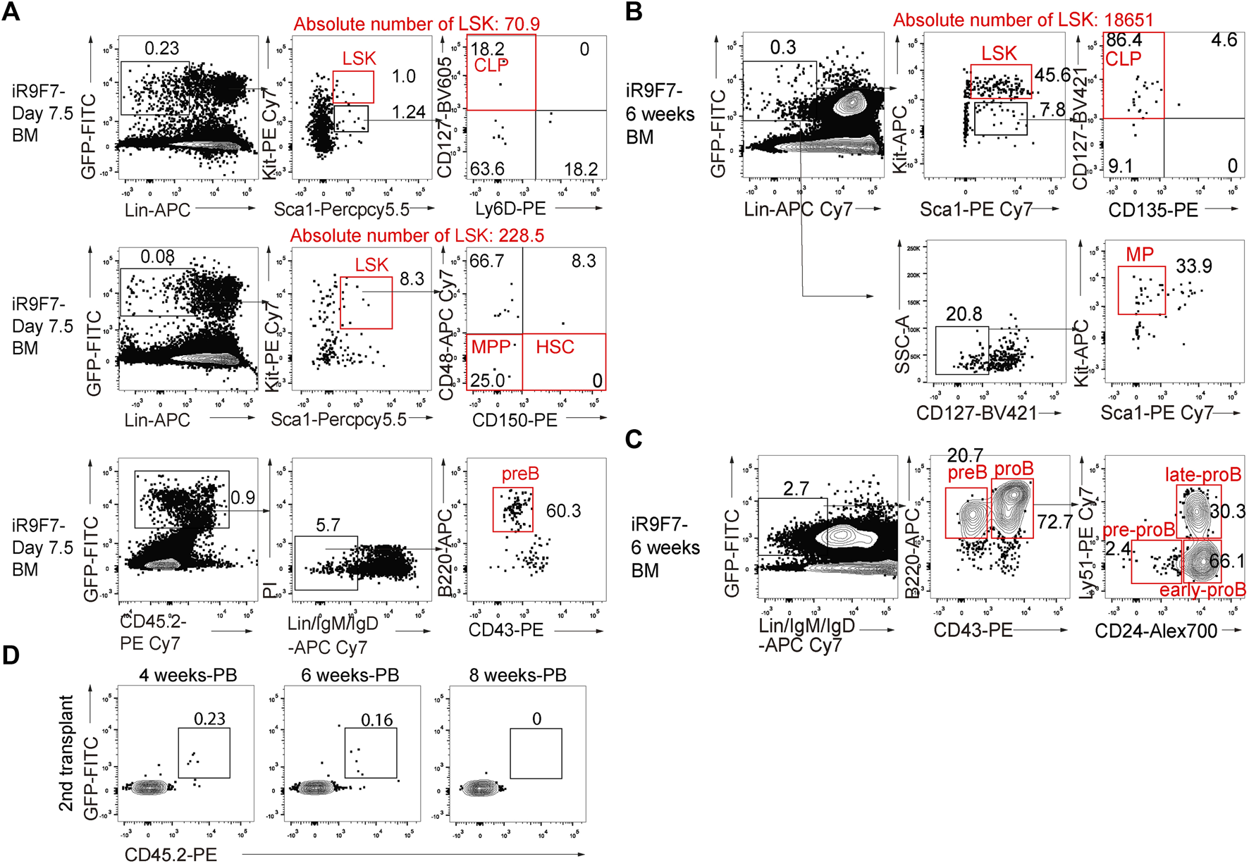 Contribution to lineage-committed progenitors of R9F7-iHPCs in B-NDG recipient mice (A) Representative flow cytometric analysis showing donor reconstitution and lineage-committed progenitors from iHPCs in the bone marrow (BM) of recipients 7.5 days post-transplantation. Lin− was defined as CD2−CD3−CD4−CD8−CD11b−Gr1−Ter119−B220−NK1.1−. Common lymphoid progenitors (CLPs) were defined as Lin−KitmidSca1midCD127+. Multi-potent progenitors (MPPs) were defined as Lin−Kit+Sca1+CD150−CD48−. Pre-B cells were defined as Lin−IgM−IgD−B220+CD43−. Data from one representative recipient mouse are shown (B) Flow cytometric analysis of donor-derived immunophenotypic CLPs and myeloid progenitors (MPs) in the BM of recipients 6 weeks after transplantation. MPs were defined as Lin−CD127−Kit+Sca1−. Data from one representative recipient mouse are shown (C) Flow cytometry analysis of immunophenotypic pro-B cells and pre-B cells in the BM of recipients 6 weeks after transplantation. pro-B (Lin−IgM−IgD−B220+CD43+) and pre-B (Lin−IgM−IgD−B220+CD43−) from one representative recipient mouse are shown. Pro-B cells are further divided into three subsets of pre-pro-B, early pro-B and late pro-B on the basis of the expression of CD24 and Ly-51. Lin was defined as Ter119−Mac1−Gr1−NK1.1−CD3−CD4−CD8−(D) Flow cytometry analysis of the frequency of R9F7-iHPC-derived cells (GFP+CD45.2+) in the peripheral blood (PB) of the secondary recipient mice 4, 6, and 8 weeks post-transplantation.