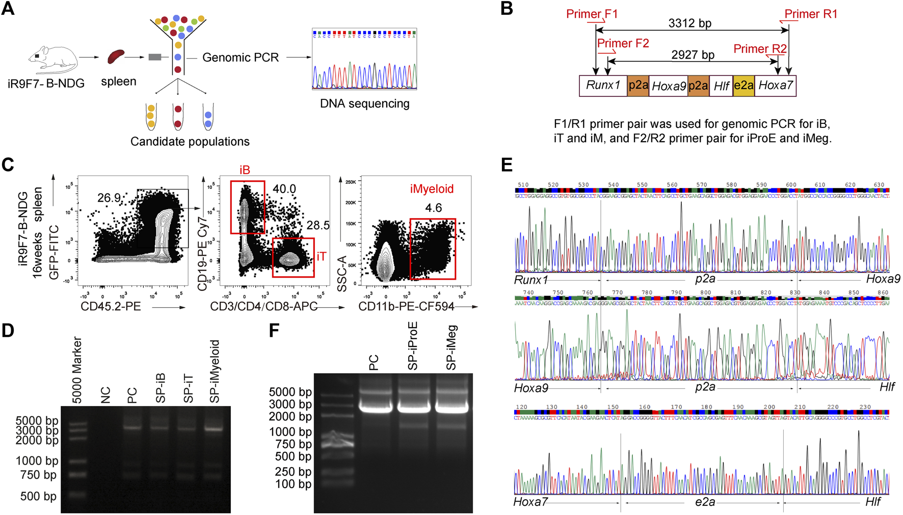 Validation of Runx1-Hoxa9-Hlf-Hoxa7 insertion in the genome of the regenerated hematopoietic lineages (A) Schematic overview of experimental strategy to validate the insertion of Runx1-Hoxa9-Hlf-Hoxa7 sequence in the genome of the regenerated hematopoietic lineages (B) Primer pairs flanking the inserted Runx1-p2a-Hoxa9-p2a-Hlf-e2a-Hoxa7 sequence element designed for genomic PCR (C) Sorting gates of iB, iT, and iMyeloid populations from the spleen of B-NDG recipient mice 16 weeks post-transplantation. The donor-derived iB cells (GFP+CD45.2+CD19+), iT cells (GFP+CD45.2+CD3+), and iMyeloid cells (GFP+CD45.2+CD11b+) were isolated for genome PCR and subsequent sequencing (D) PCR bands of Runx1-Hoxa9-Hlf-Hoxa7 in the regenerated B, T, and myeloid cells from the spleen (SP) of recipients. Water was used as DNA template negative control (NC) to exclude DNA contaminants. The plasmid containing Runx1-p2a-Hoxa9-p2a-Hlf-e2a-Hoxa7 element was used as positive control (PC). 200 ng DNA of amplified genome of each cell population was used as template for PCR of Runx1-p2a-Hoxa9-p2a-Hlf-e2a-Hoxa7 element (E) Sequencing result of the PCR products of iB cells from one representative recipient mouse visualized by chromas software (F) Genome PCR bands of Runx1-Hoxa9-Hlf-Hoxa7 in the regenerated erythroid progenitor cells (iProE: GFP+Ter119loCD71+) and megakaryocytes (iMeg: GFP+Lin−Ter119-CD41+CD61+) from the spleen (SP) of recipients 7.5 days post-transplantation. The plasmid containing Runx1-p2a-Hoxa9-p2a-Hlf-e2a-Hoxa7 element was used as positive control (PC).