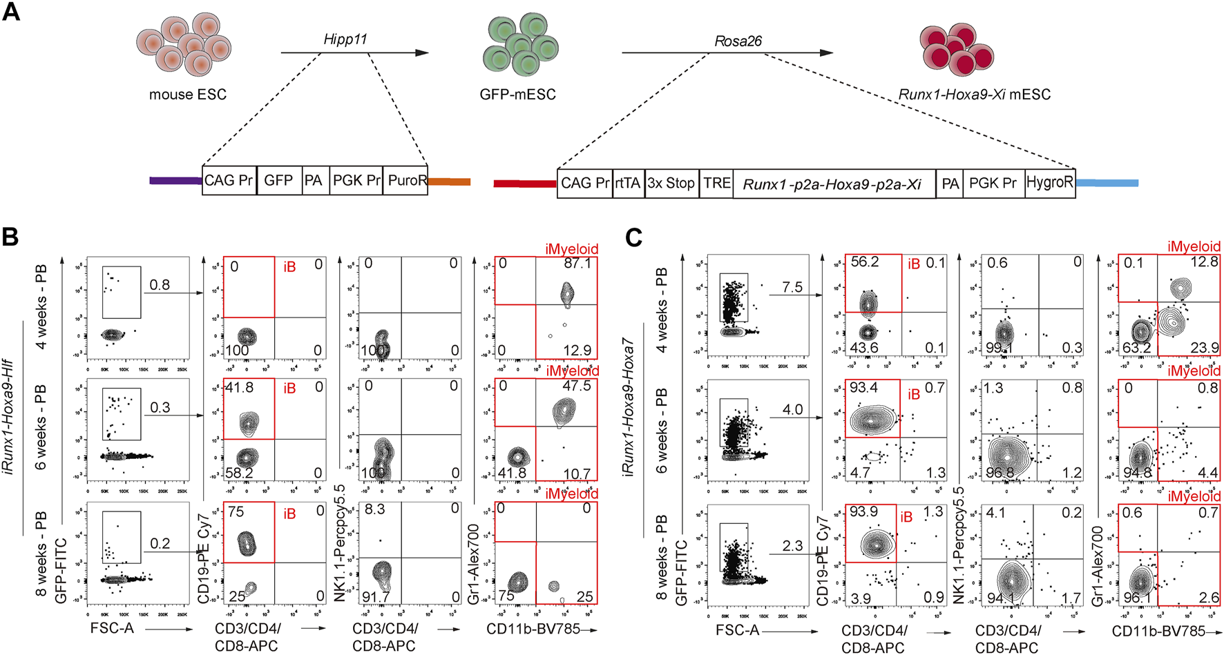 Effects of forced expression of Runx1-Hoxa9-Hlf or Runx1-Hoxa9-Hoxa7 during hematopoietic induction from ESCs (A) Schematic diagram of iRunx1+Hoxa9+Xi mouse ESC lines construction. Xi means transcription factor Hlf or Hoxa7(B) Chimerism and lineage constitution in the peripheral blood (PB) of recipients receiving iHPCs from iRunx1+Hoxa9+Hlf mouse ESCs (iR9F-ESCs) analyzed by flow cytometry 4, 6, and 8 weeks post-transplantation. Data from one representative recipient mouse are shown (C) Chimerism and lineage constitution in the PB of recipients receiving iHPCs from iRunx1+Hoxa9+Hoxa7 mouse ESCs (iR9A7-ESCs) analyzed by flow cytometry 4, 6, and 8 weeks post-transplantation. Data from one representative recipient mouse are shown.