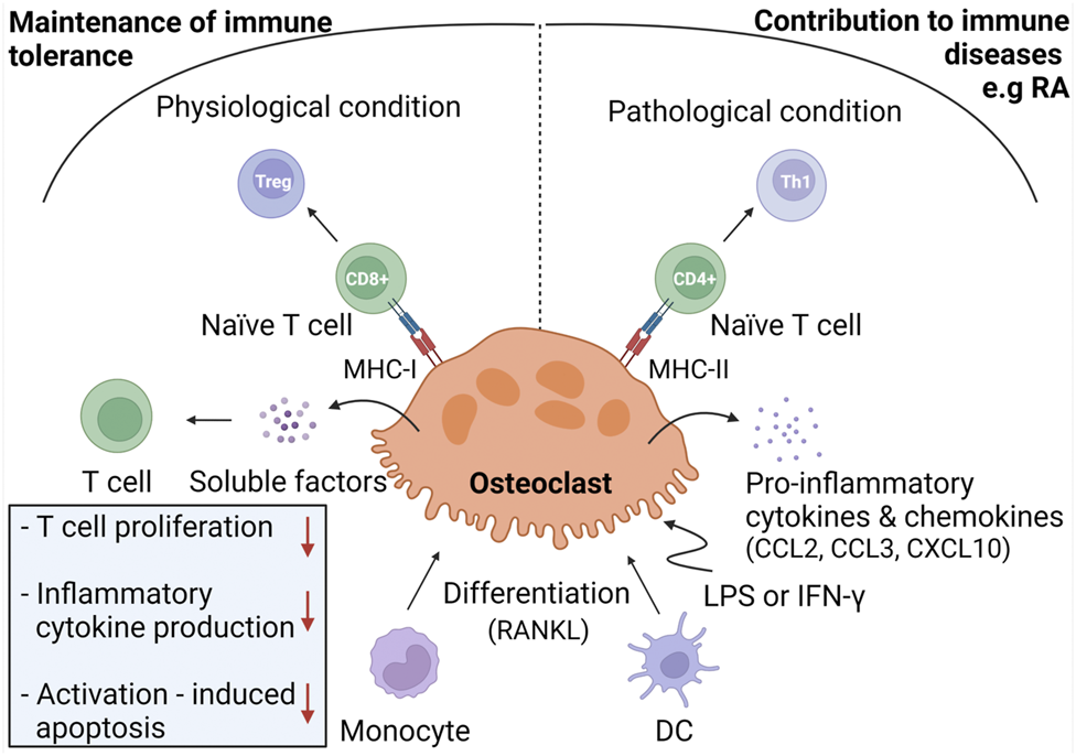 Immunoregulation by osteoclasts. Under physiological conditions, osteoclasts are considered to be derived from monocyte progenitor cells and exhibit immunomodulatory activities in order to maintain immune tolerance to bone remnants. To do so, osteoclasts induce Treg cells through antigen presentation in MHC-I complexes towards CD8+ T cells. Osteoclasts inhibit T cell proliferation, production of inflammatory cytokines, and activation-induced apoptosis through release of soluble mediators. Under inflammatory conditions, osteoclasts are hypothesized to derive from DC and to contribute to immune diseases, including RA. In response to LPS or IFN-γ, osteoclasts produce pro-inflammatory mediators and differentiate naïve T cells into Th1 cells through antigen presentation in MHC-II molecules.